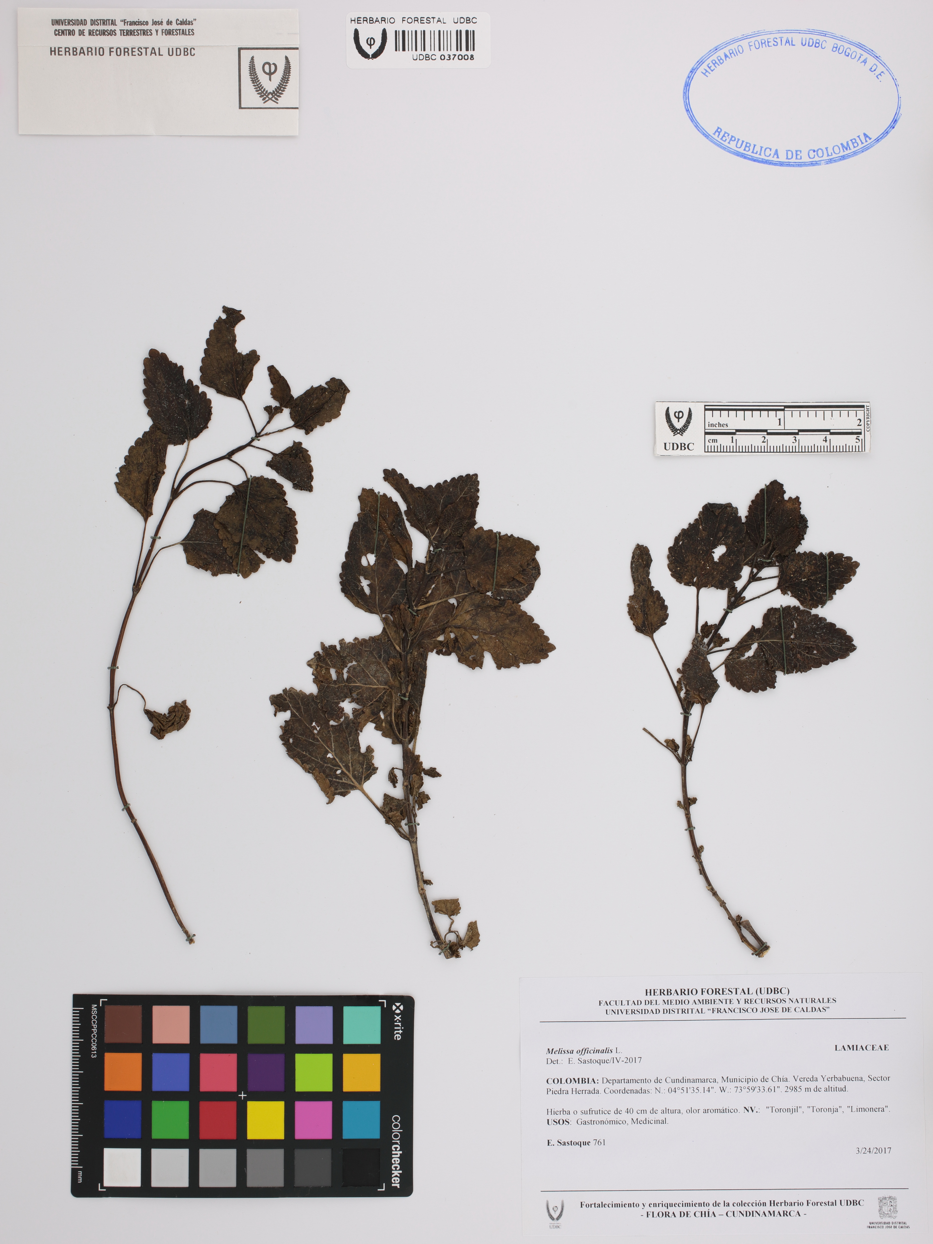 Fotografía del ejemplar Sastoque, E. 761, determinado como Melissa officinalis en el año 2017