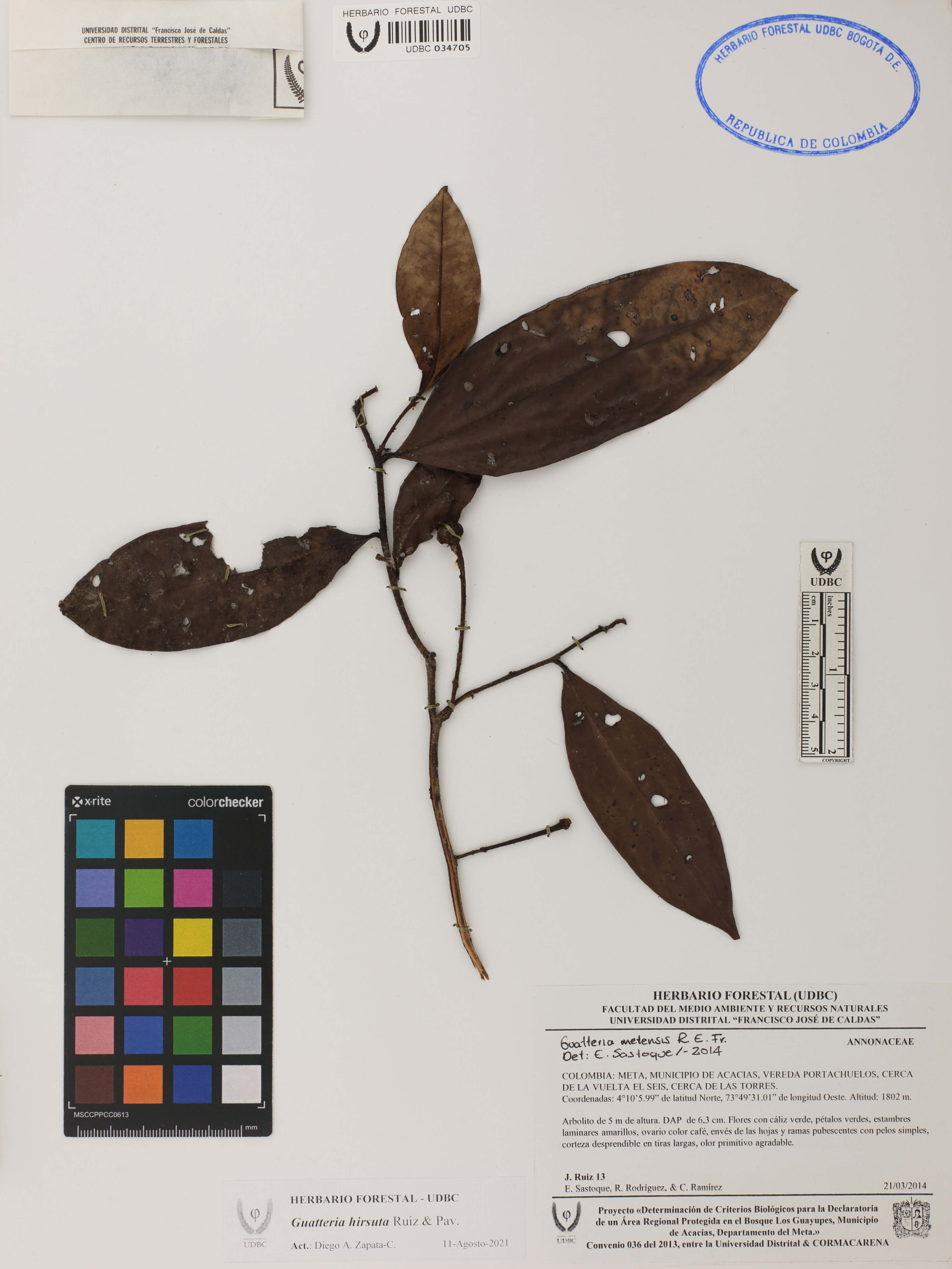 Fotografía del ejemplar Ruiz, J. 13, determinado como Guatteria hirsuta en el año 2014