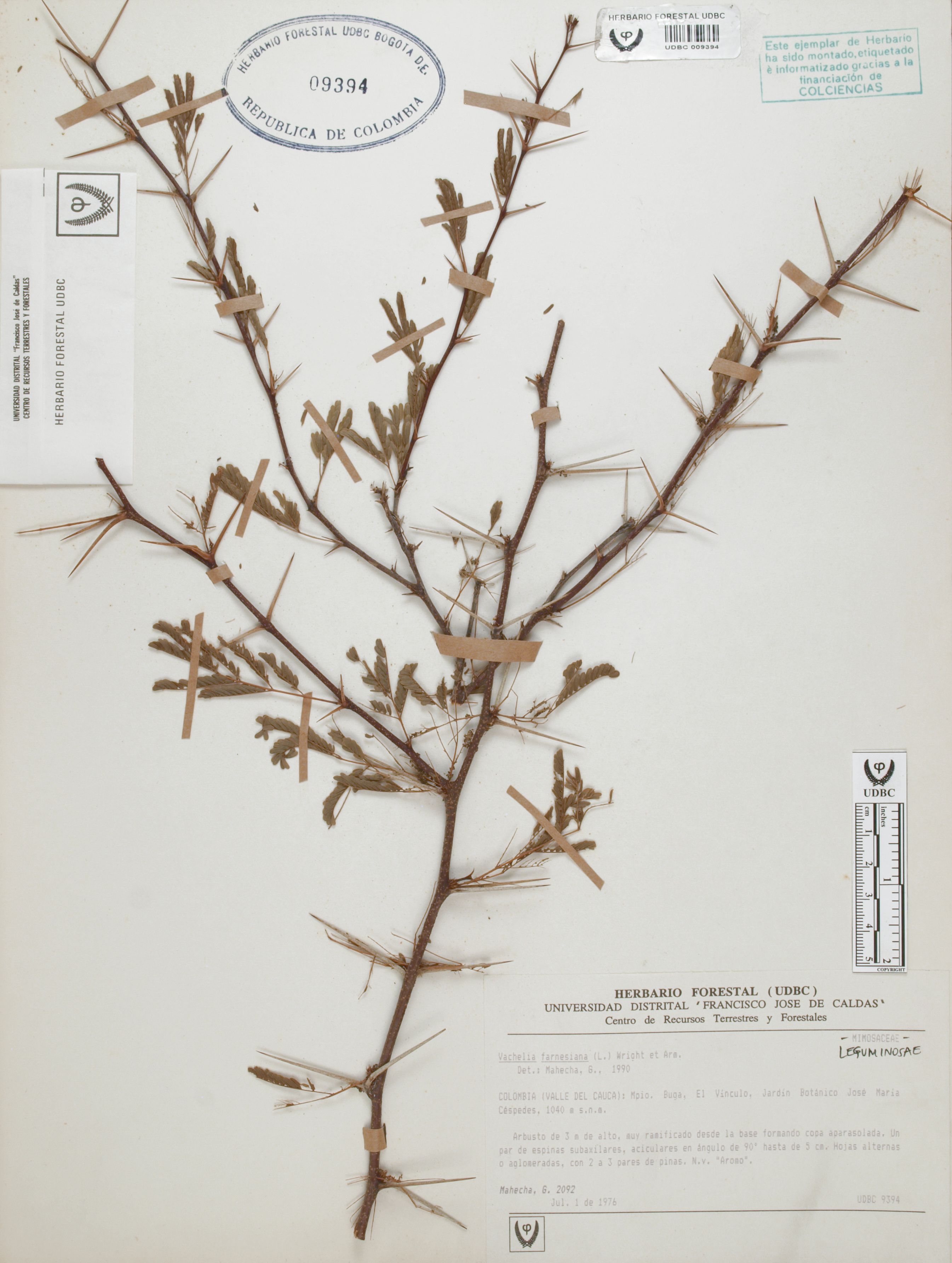 Fotografía del ejemplar Mahecha, G. 2092, determinado como Vachellia farnesiana en el año 1990