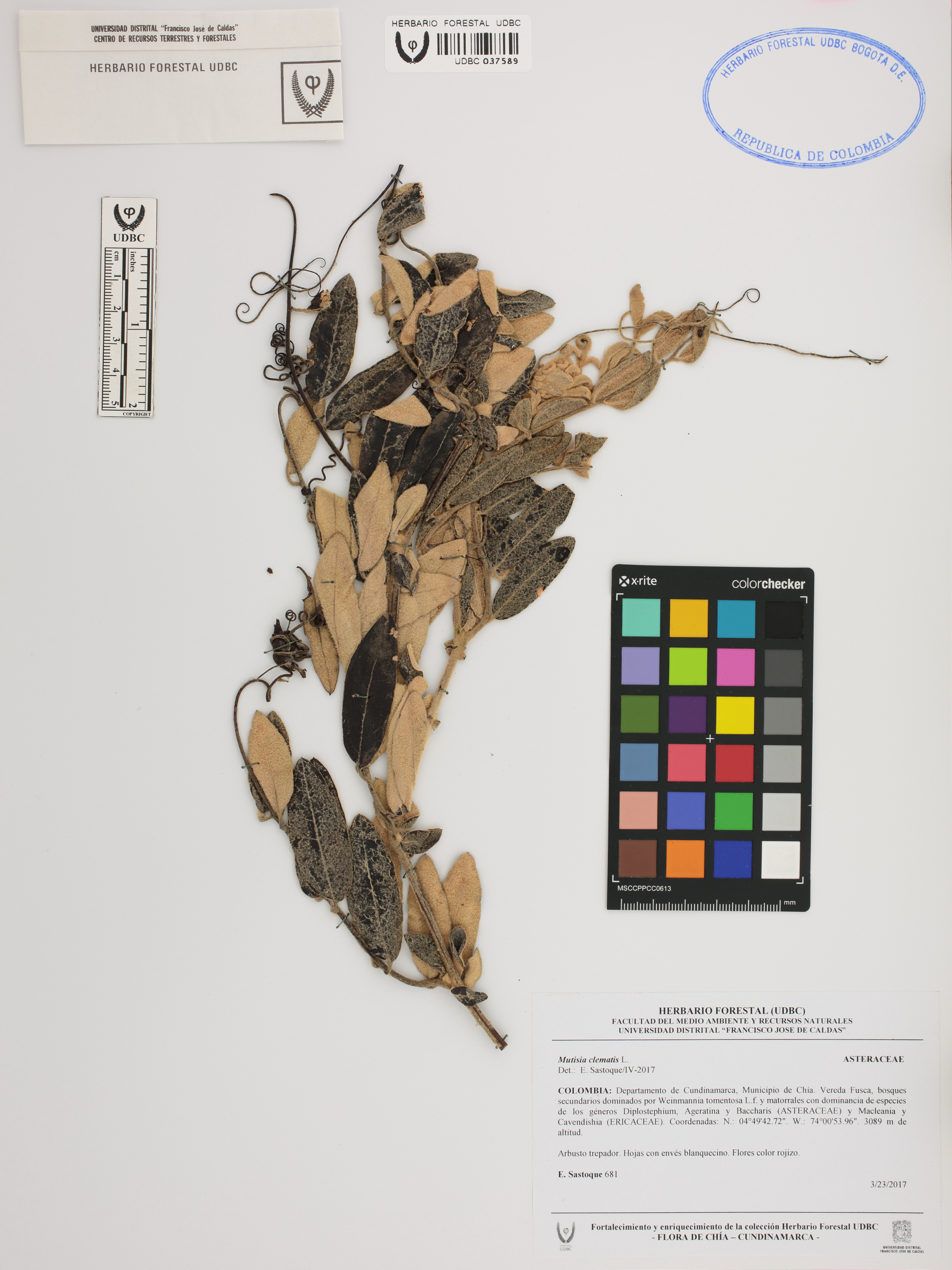 Fotografía del ejemplar Sastoque, E. 681, determinado como Mutisia clematis en el año 2017