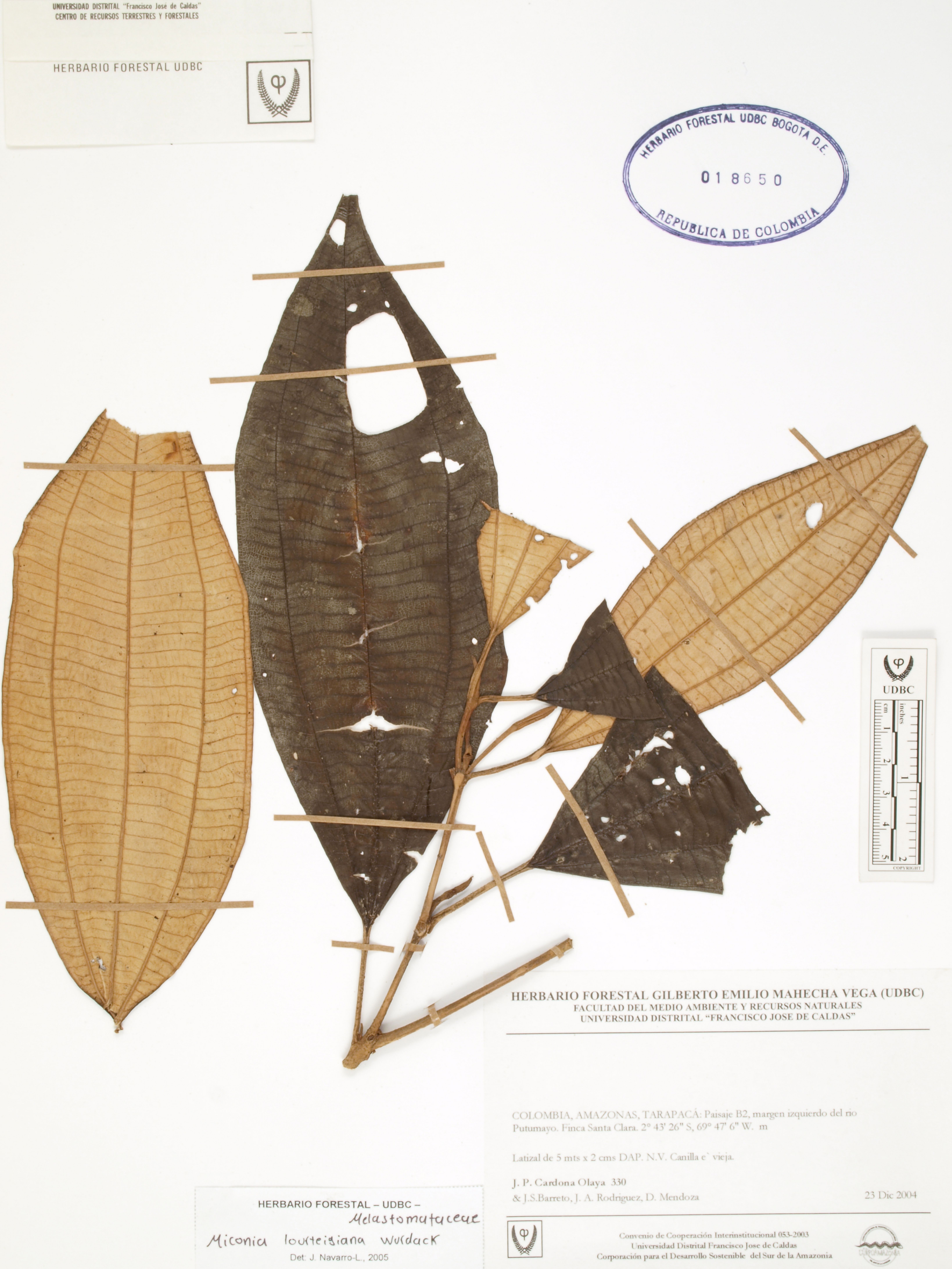 Fotografía del ejemplar Cardona, J. 330, determinado como Miconia lourteigiana en el año 2005