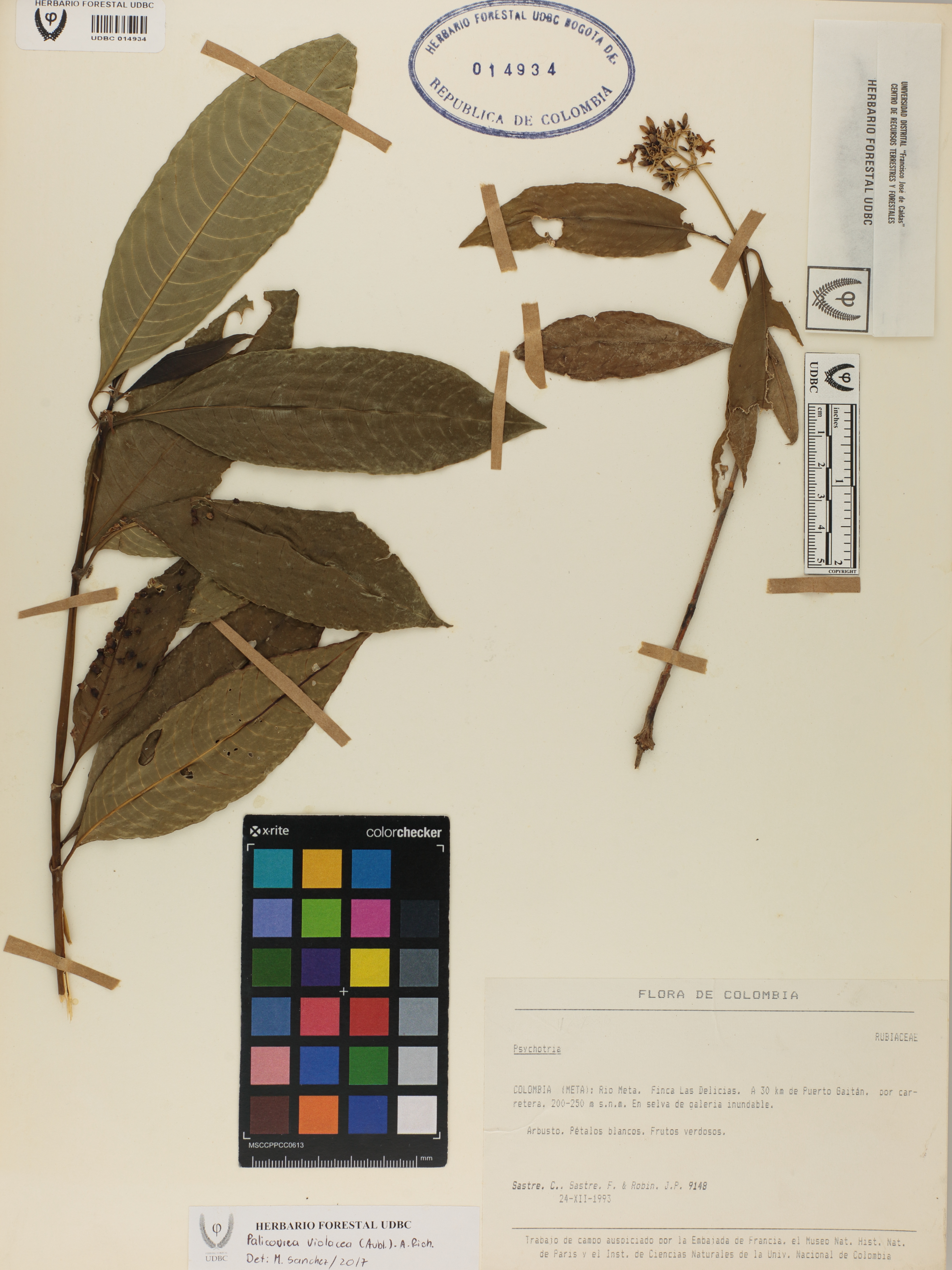 Fotografía del ejemplar Sastre, C. 9148, determinado como Palicourea violacea en el año 2017