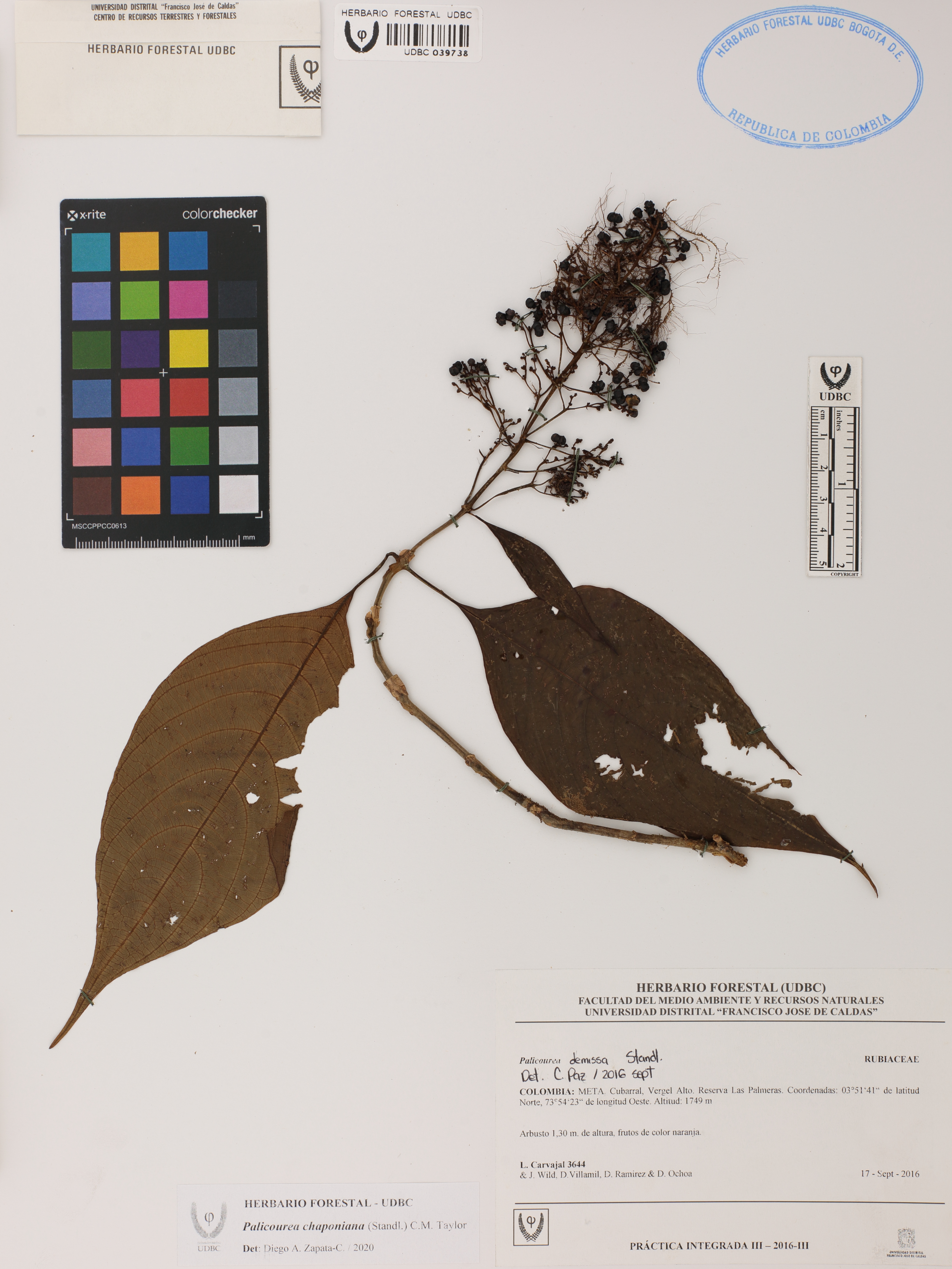 Fotografía del ejemplar Carvajal, L. 3644, determinado como Palicourea chaponiana en el año 2020