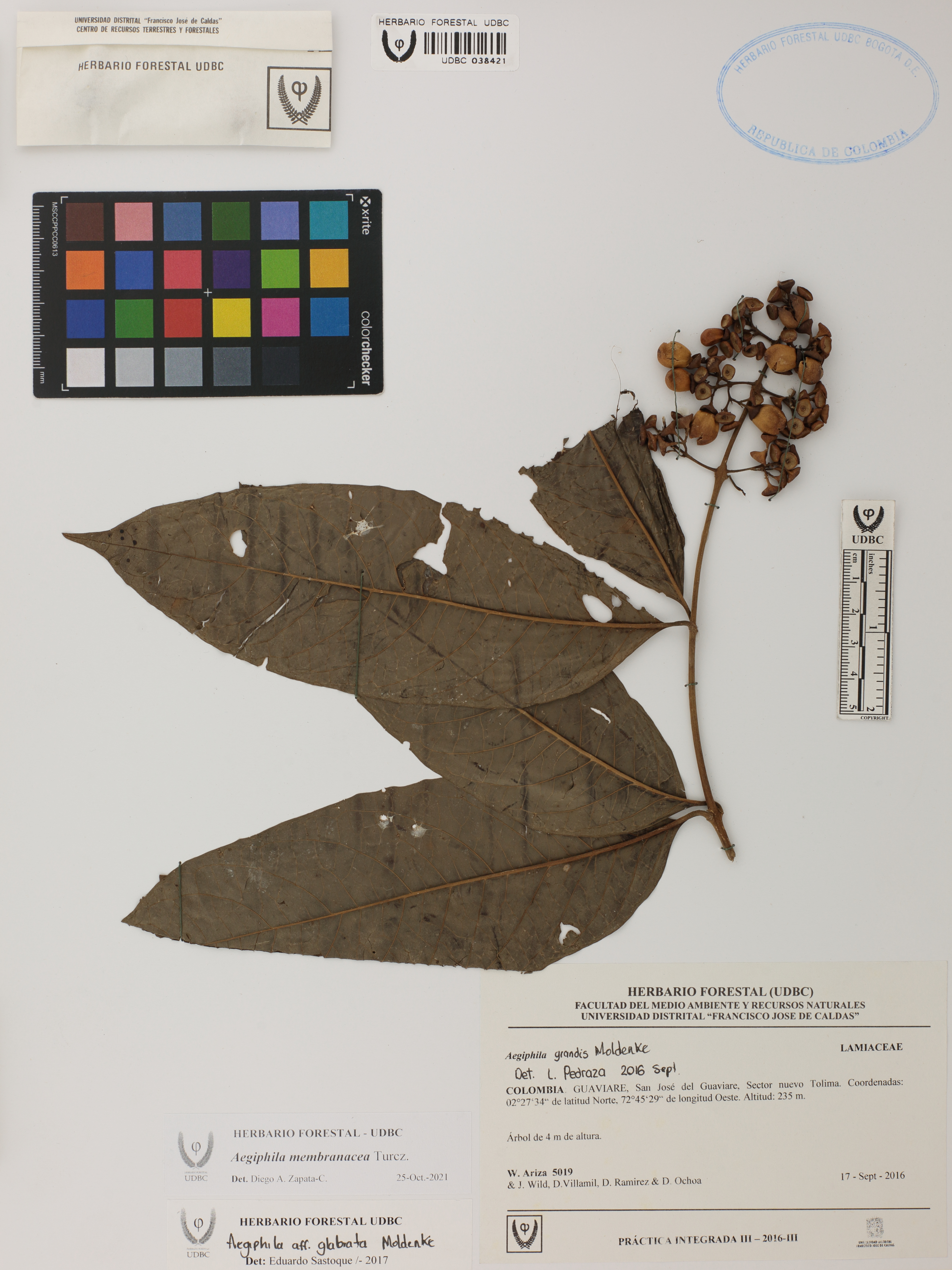 Fotografía del ejemplar Ariza, W. 5019, determinado como Aegiphila membranacea en el año 2021