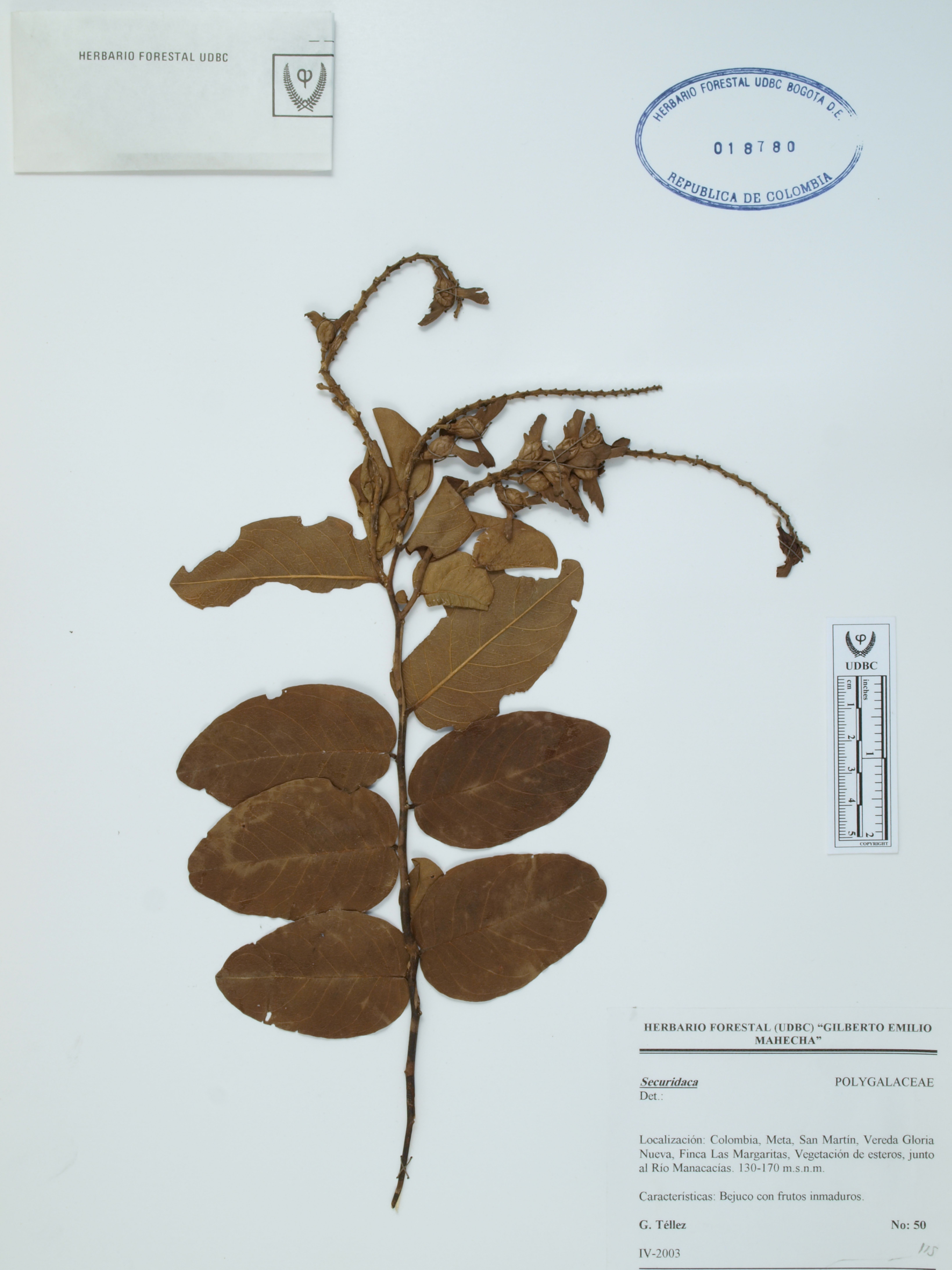 Fotografía del ejemplar Téllez, G. 50, determinado como Securidaca sp.
