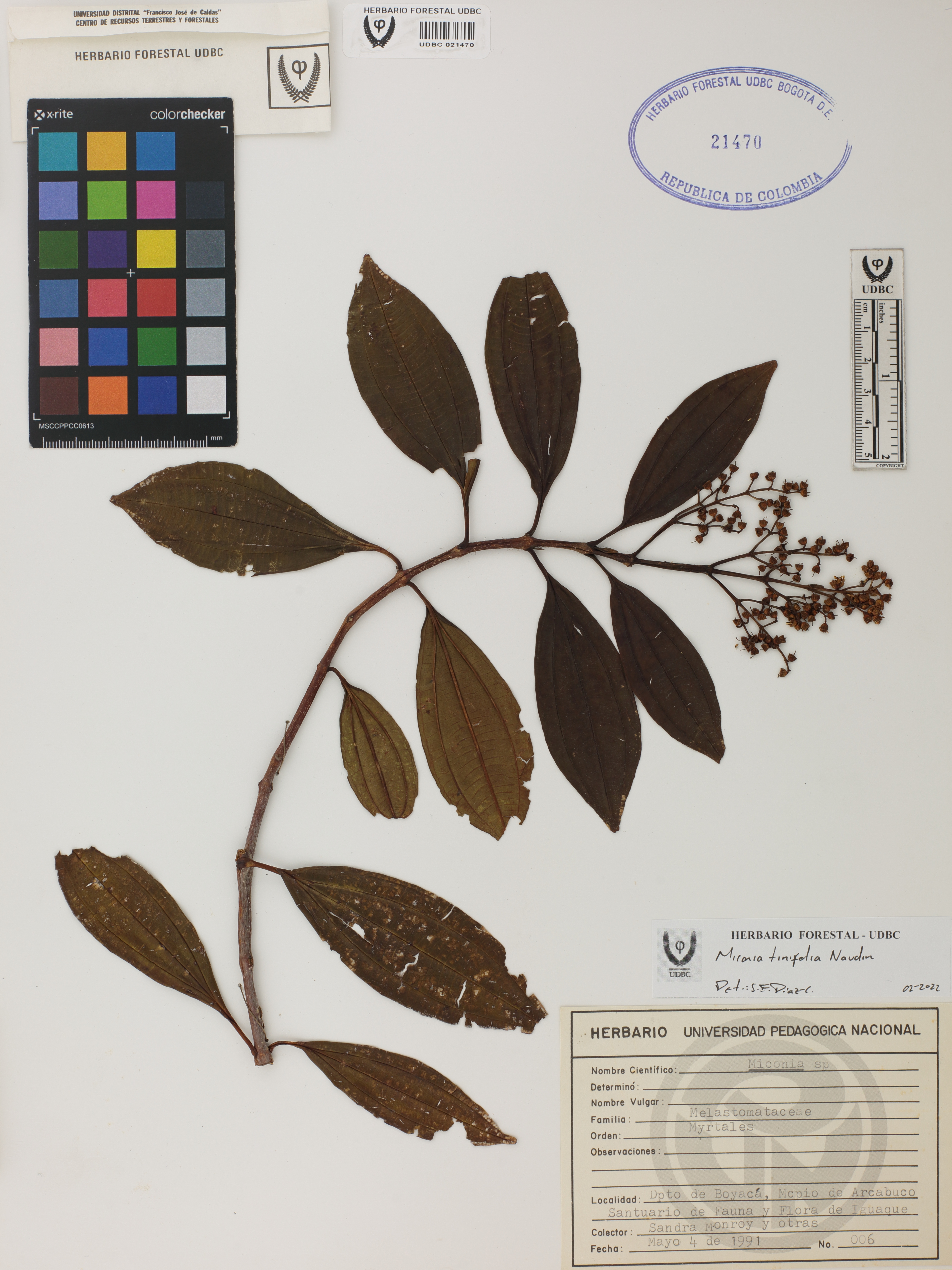 Fotografía del ejemplar Monroy, S. 6, determinado como Miconia tinifolia en el año 2022