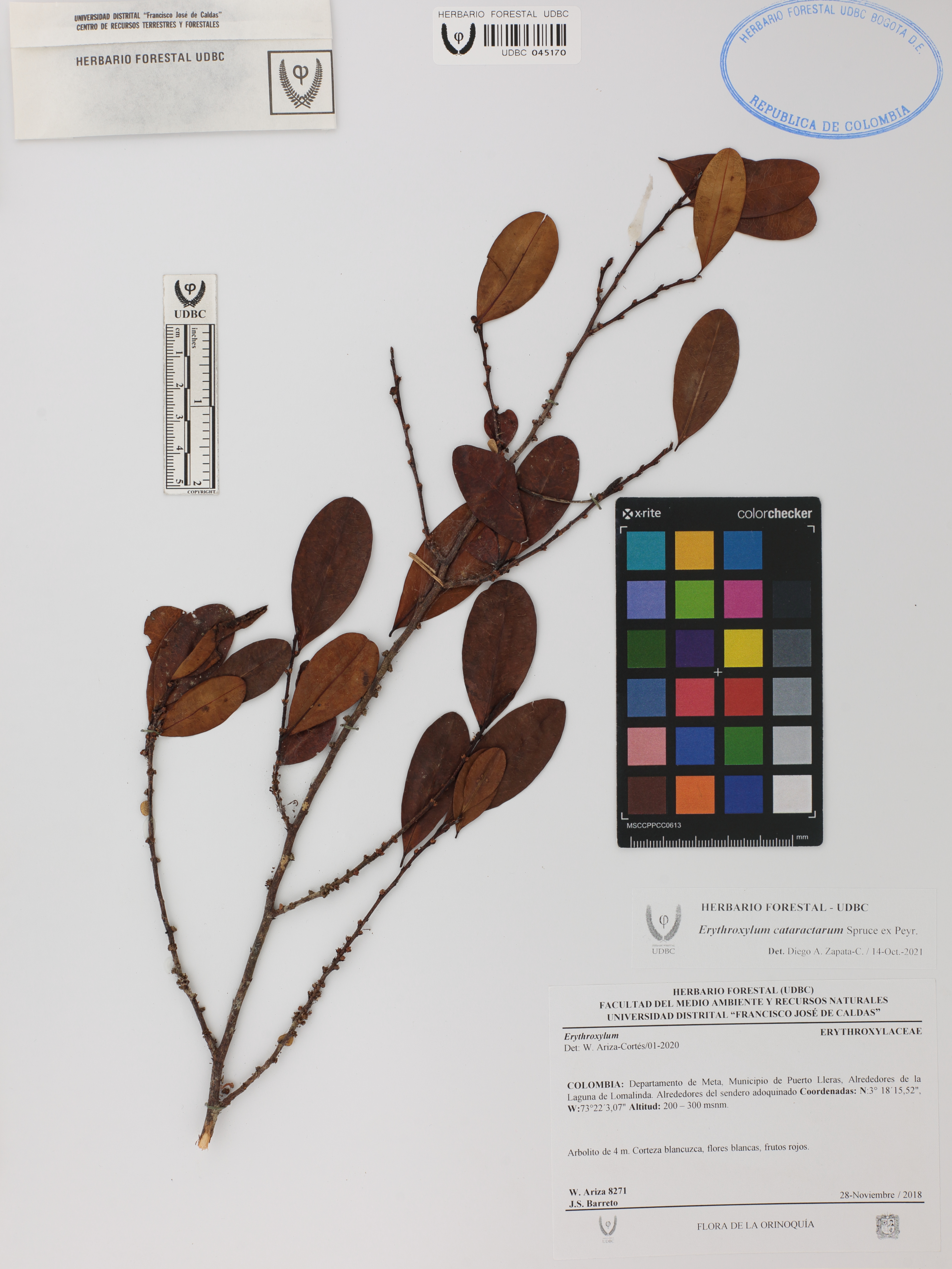 Fotografía del ejemplar Ariza-Cortés, W. 8271, determinado como Erythroxylum cataractarum en el año 2021