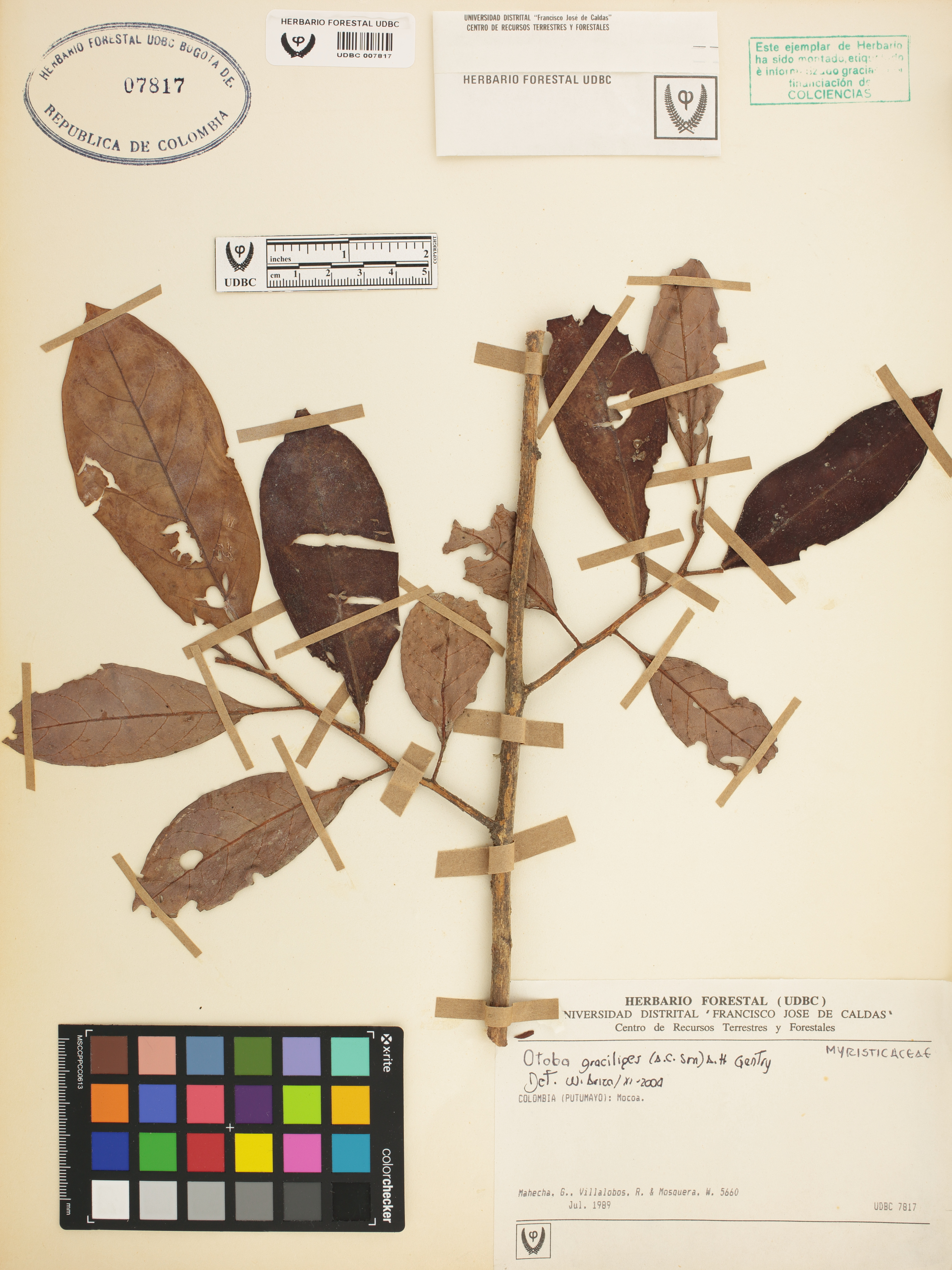 Fotografía del ejemplar Mahecha, G. 5660, determinado como Otoba gracilipes en el año 2004