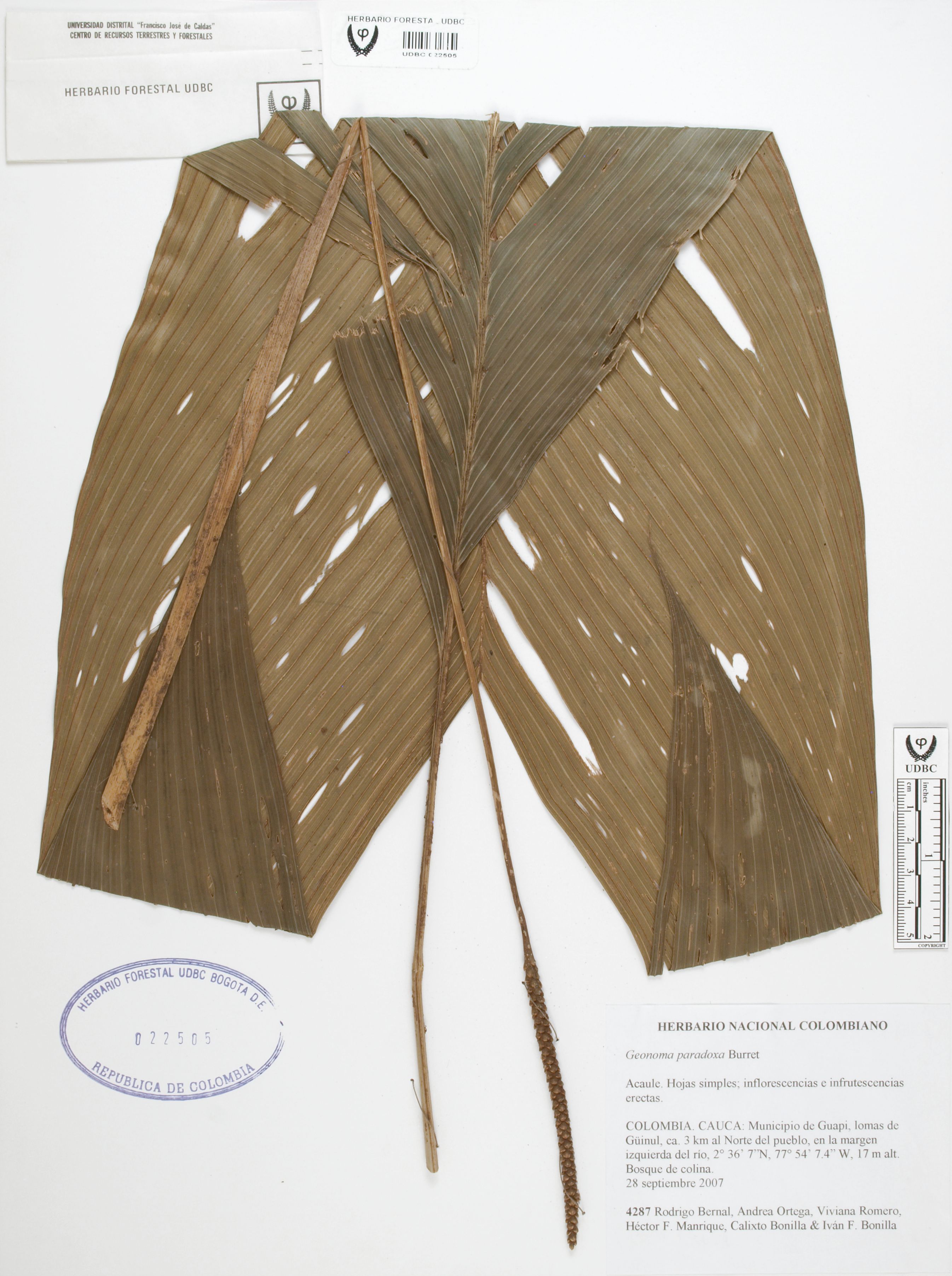 Fotografía del ejemplar Bernal, R. 4287, determinado como Geonoma paradoxa
