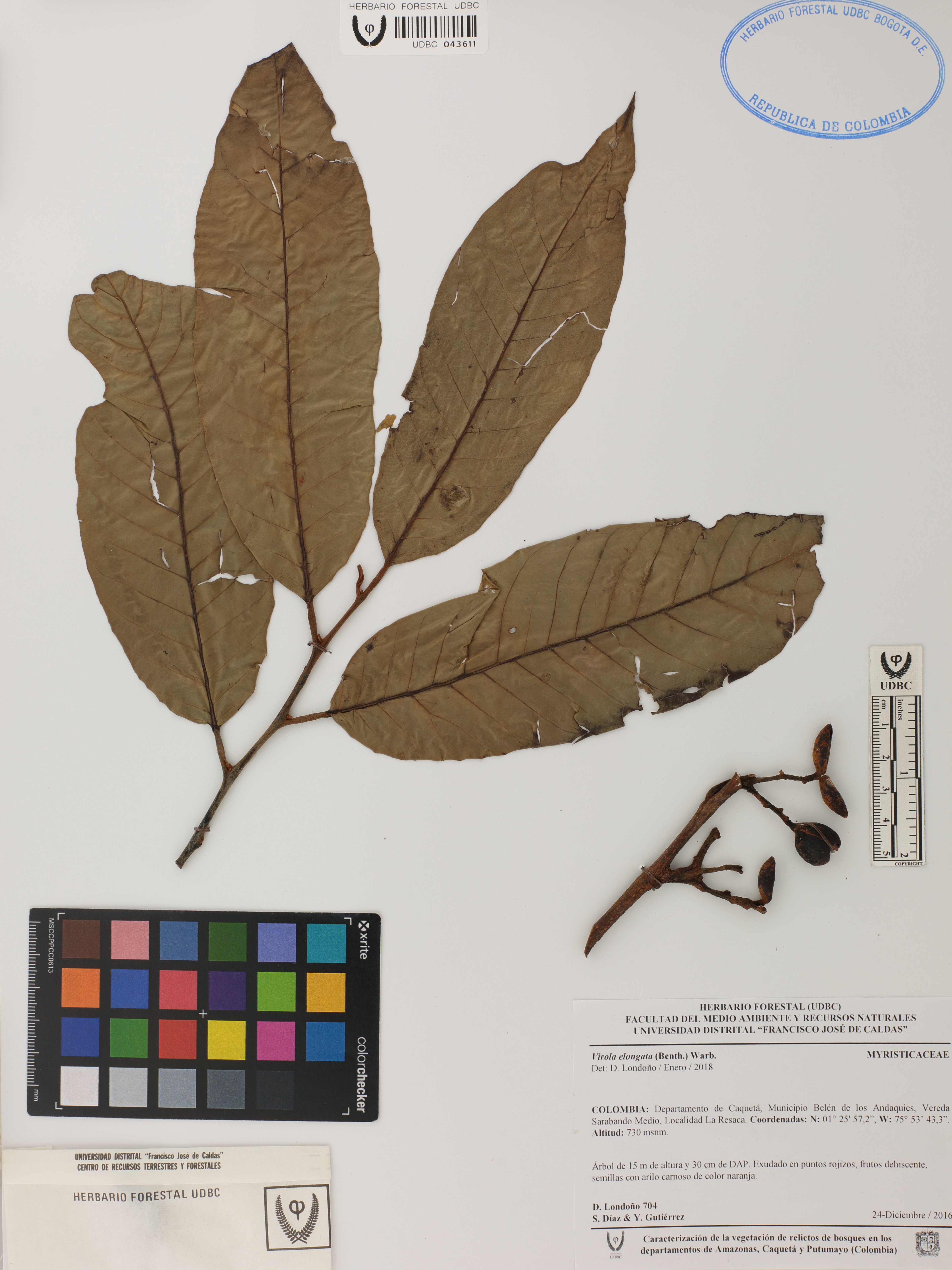 Fotografía del ejemplar Londoño, D. 704, determinado como Virola elongata en el año 2018