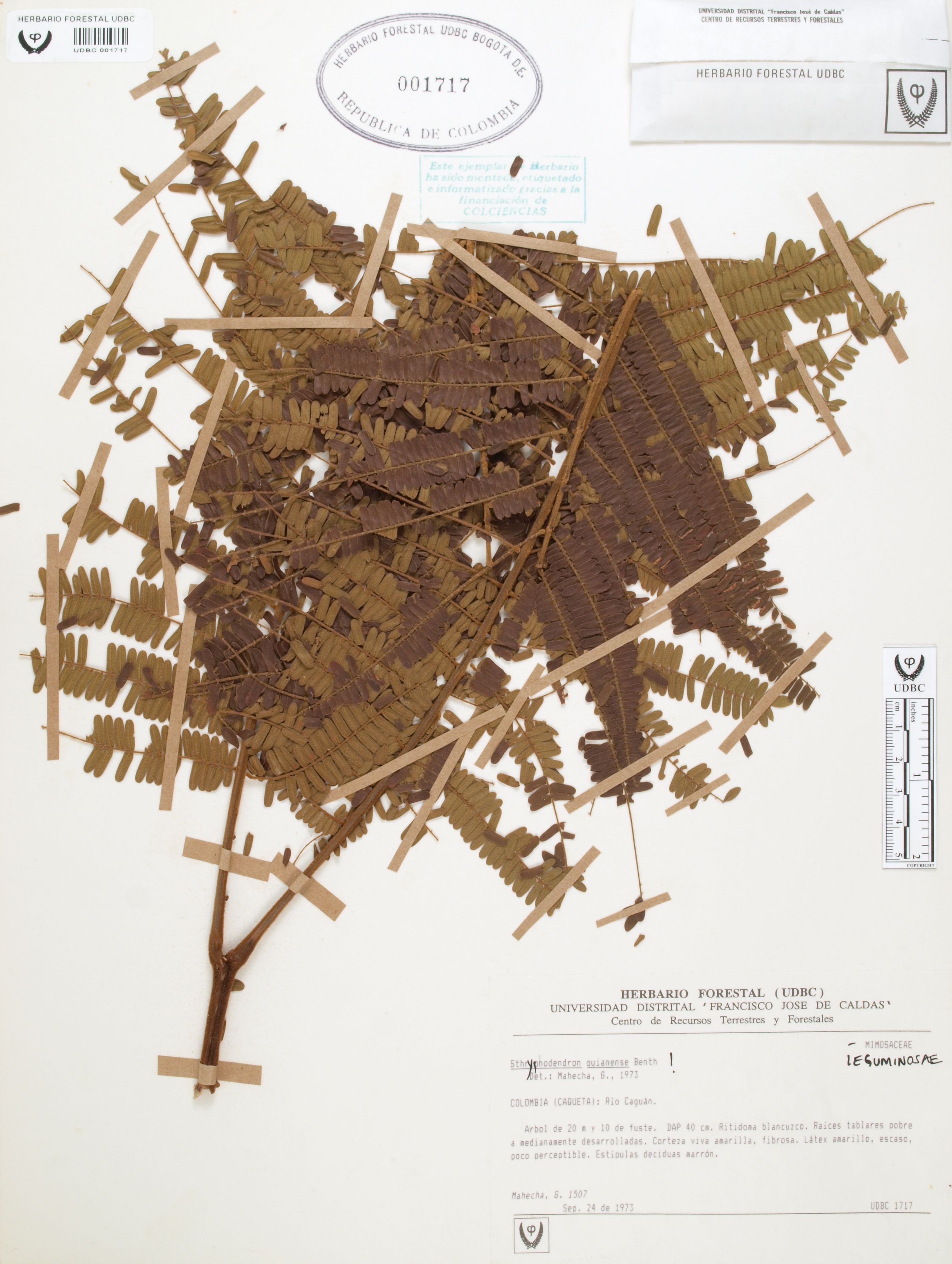 Fotografía del ejemplar Mahecha, G. 1507, determinado como Stryphnodendron guianense en el año 1973