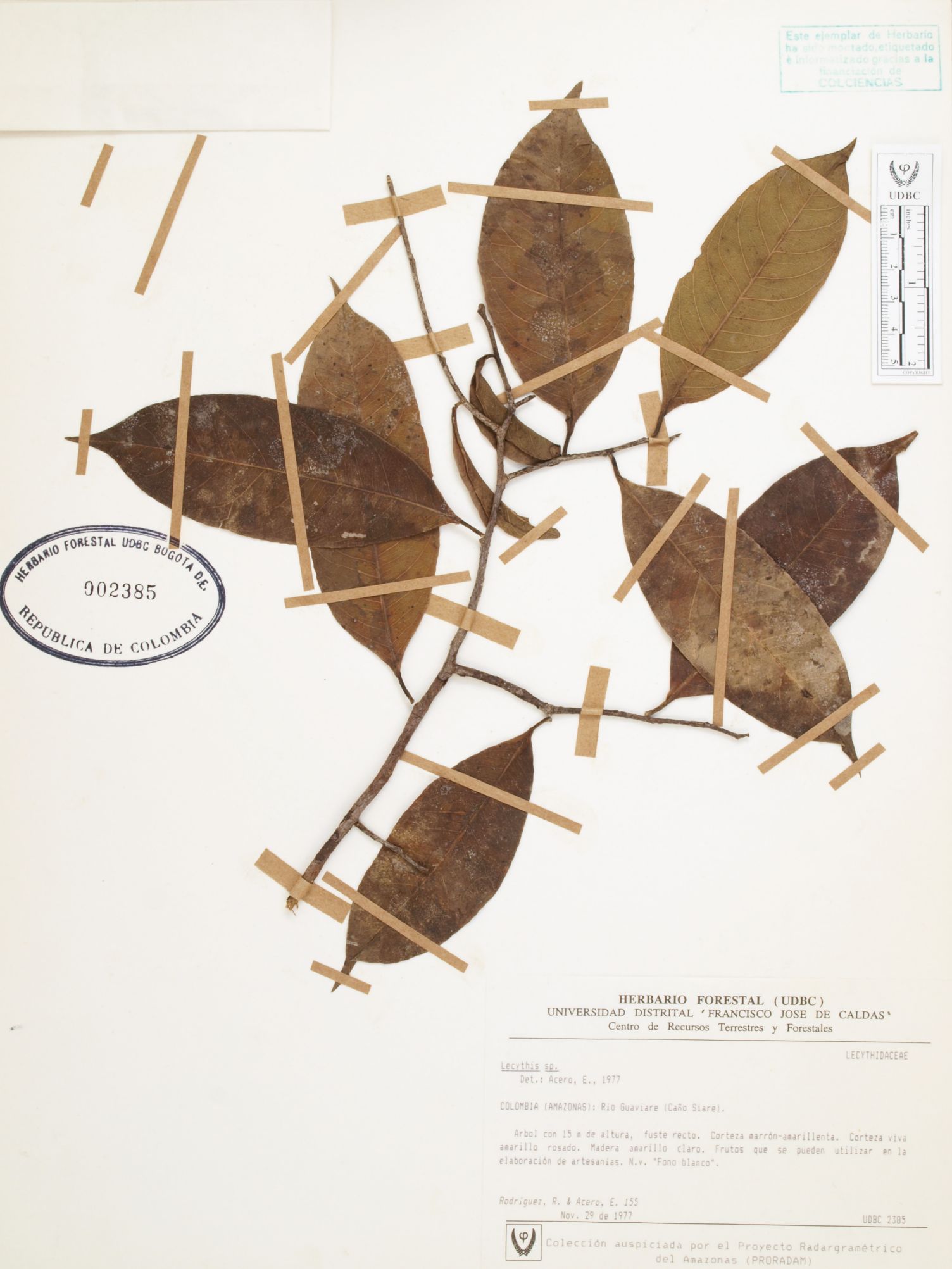 Fotografía del ejemplar Rodríguez, R. 155, determinado como Lecythis sp. en el año 1977