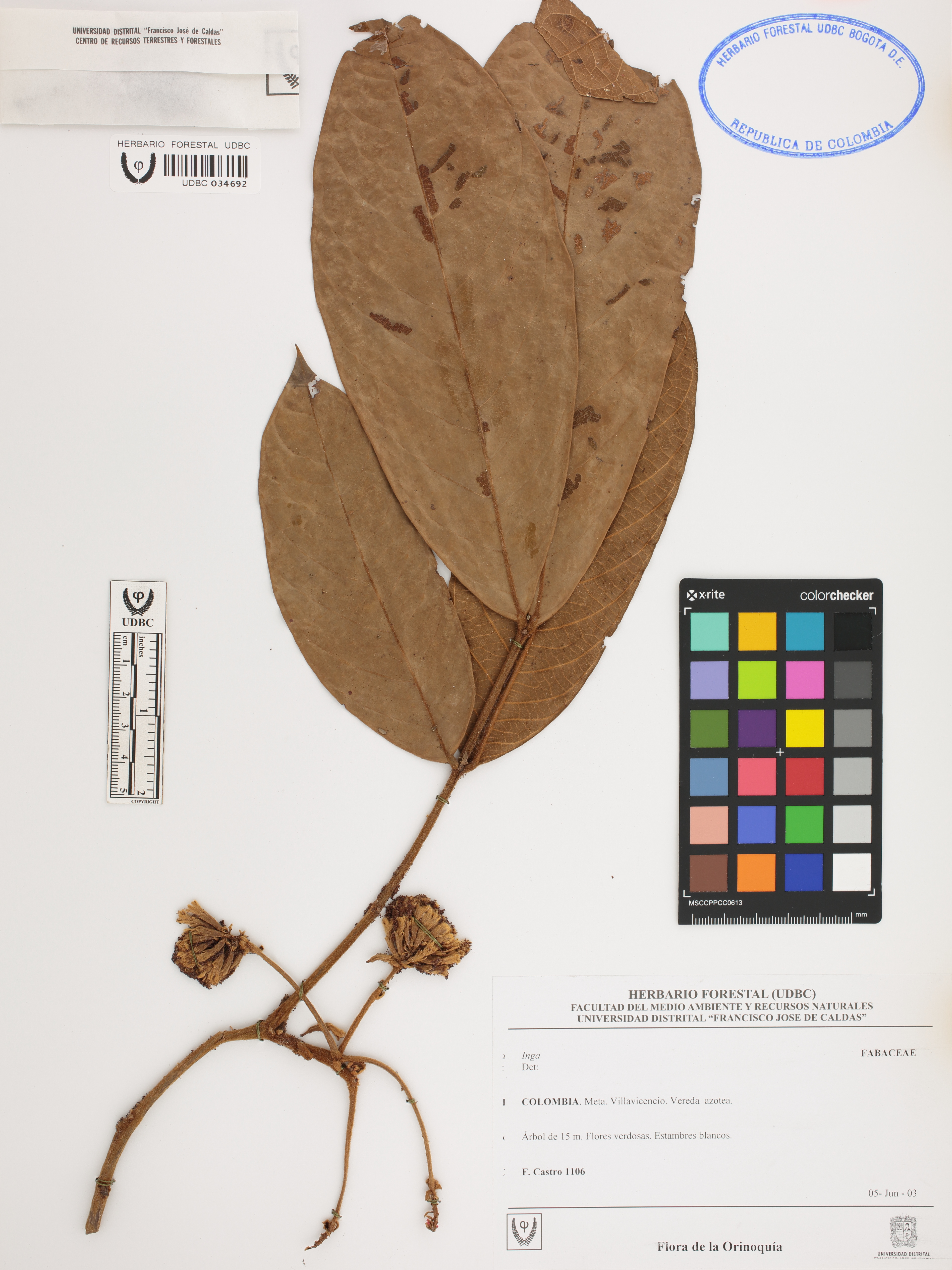 Fotografía del ejemplar Castro, F. 1106, determinado como Inga sp.
