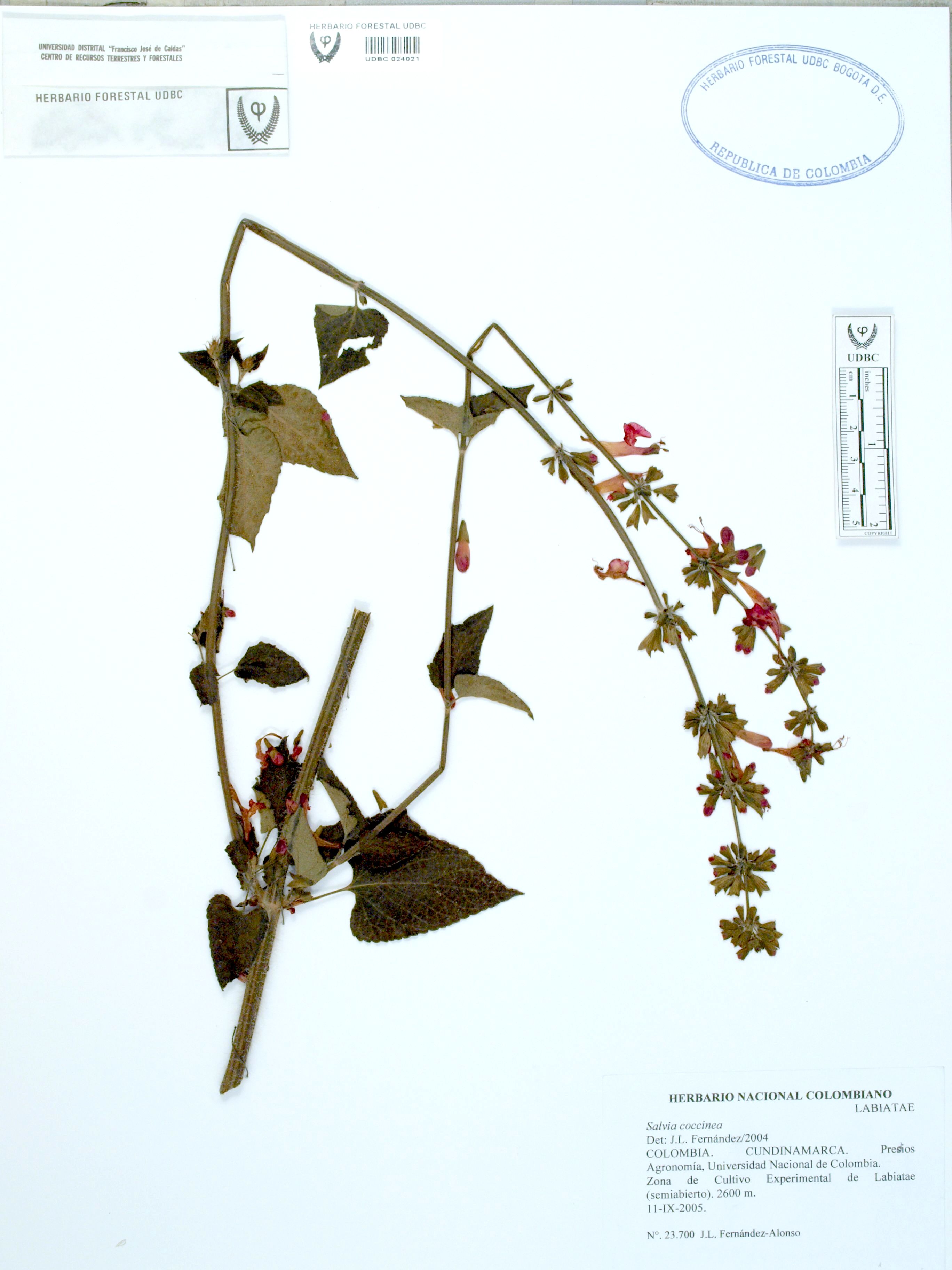Fotografía del ejemplar Fernández-Alonso, J. 23700, determinado como Salvia coccinea en el año 2004