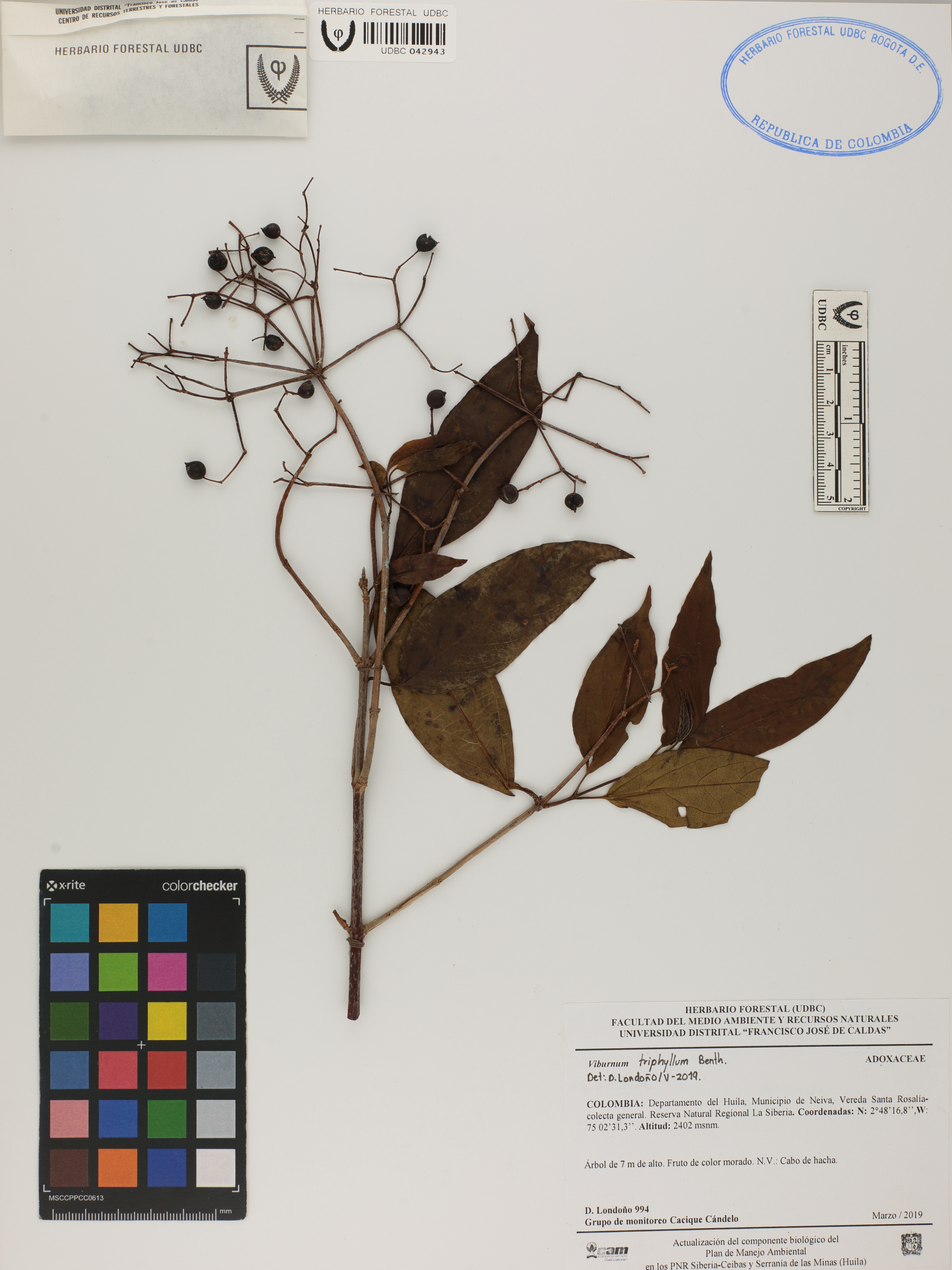 Fotografía del ejemplar Londoño, D. 994, determinado como Viburnum triphyllum en el año 2019