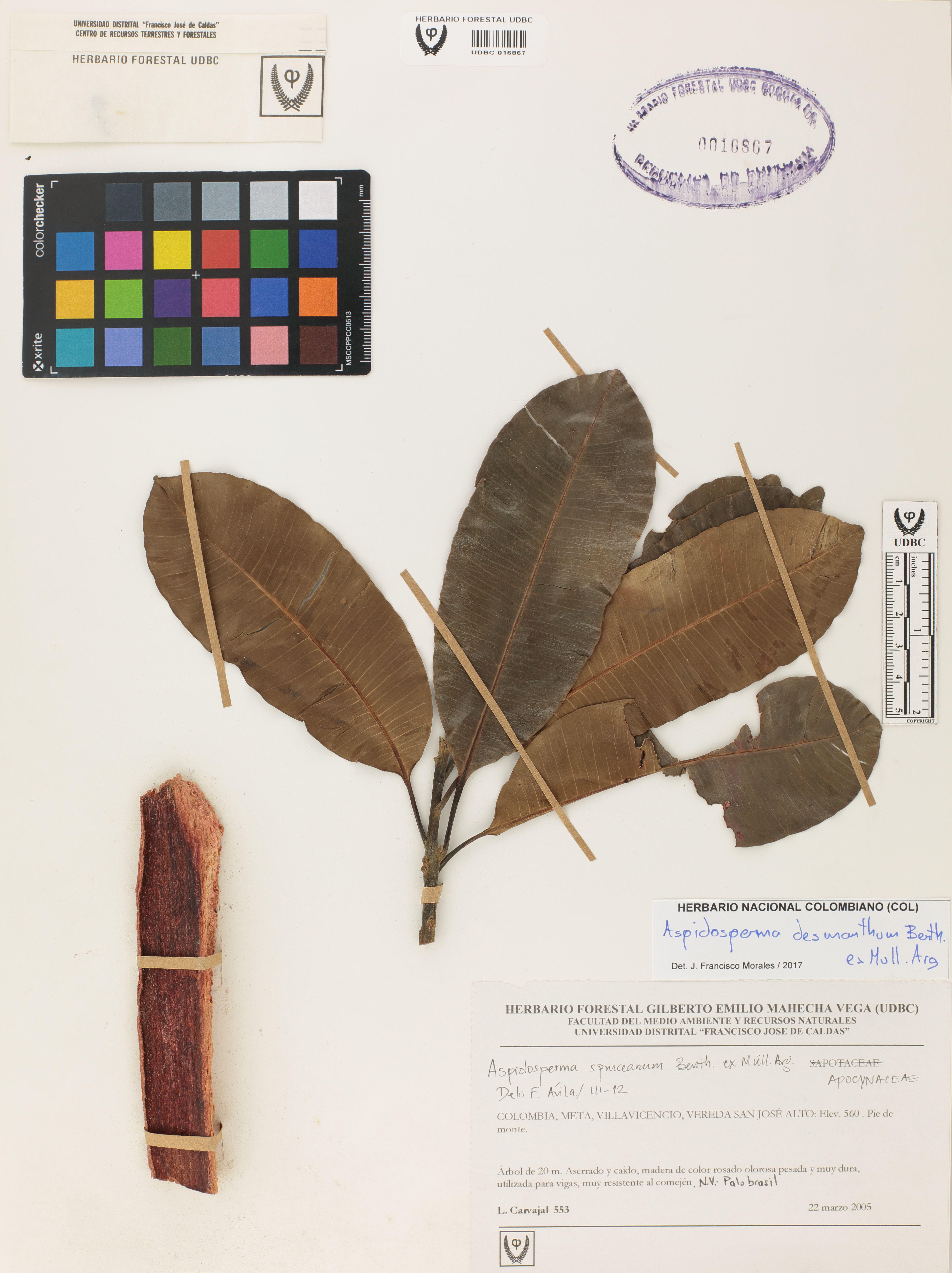 Fotografía del ejemplar Carvajal, L. 553, determinado como Aspidosperma spruceanum en el año 2012