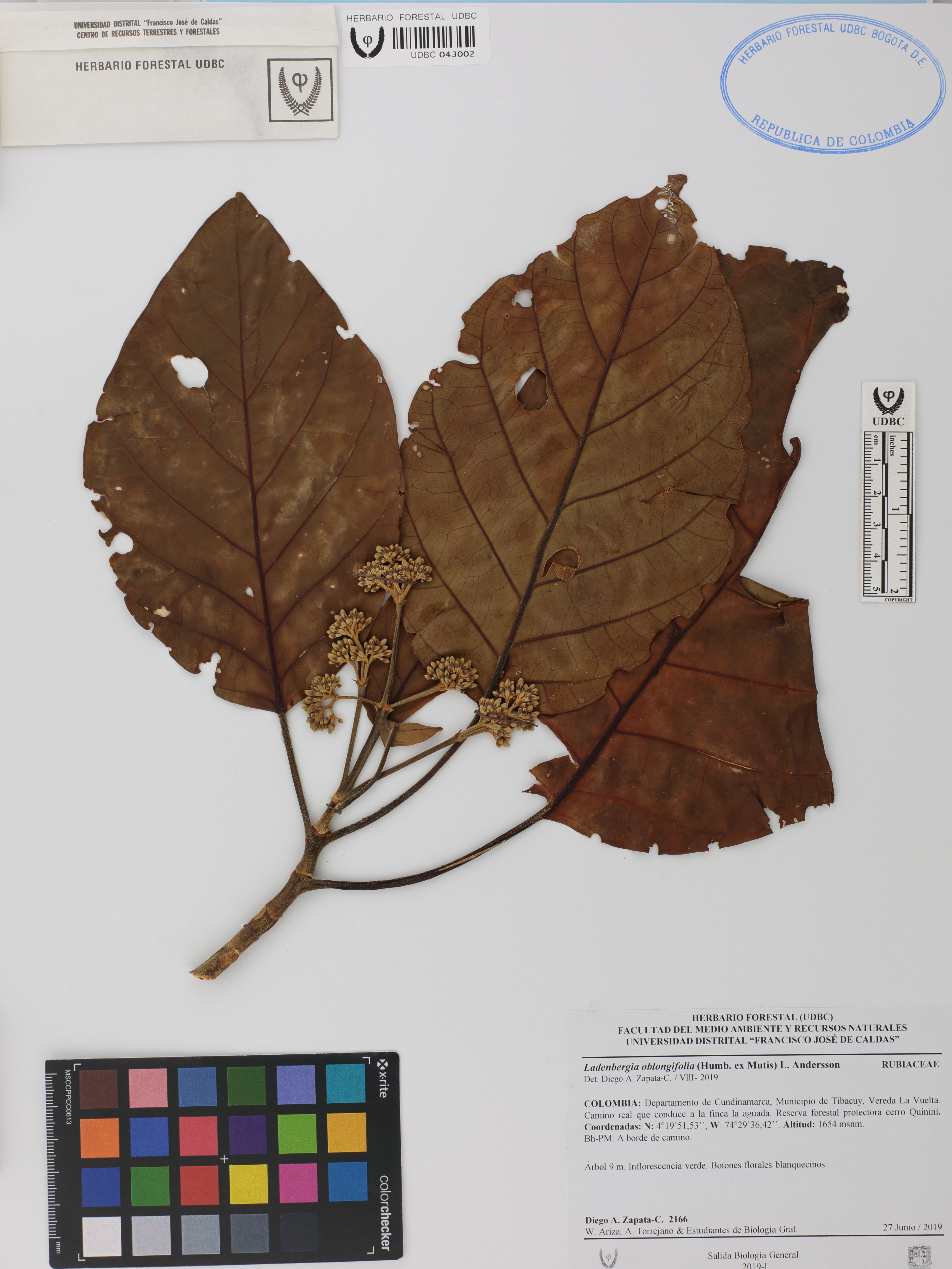 Fotografía del ejemplar Zapata-C., D. 2166, determinado como Ladenbergia oblongifolia en el año 2019