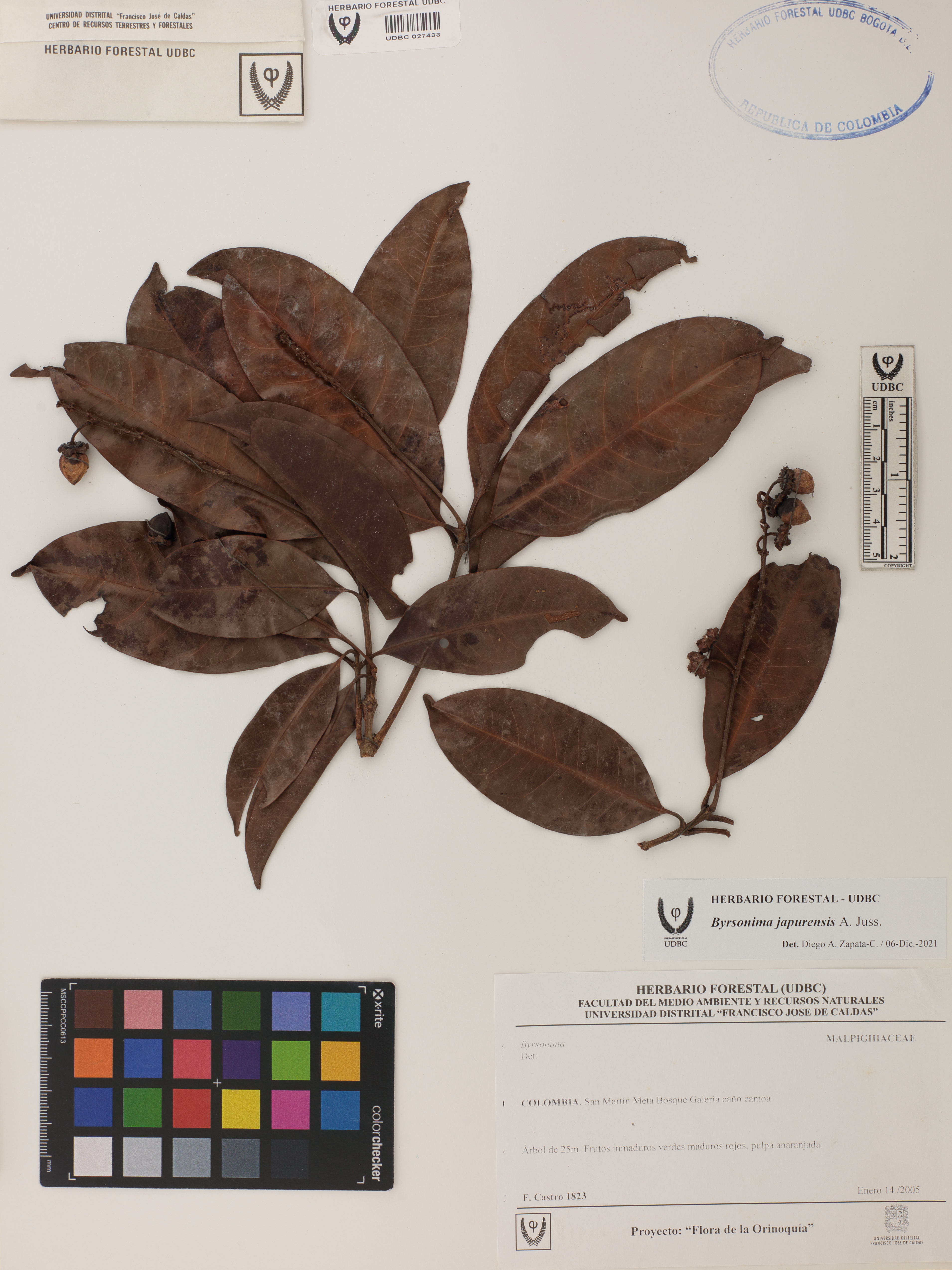Fotografía del ejemplar Castro, F. 1823, determinado como Byrsonima japurensis en el año 2021