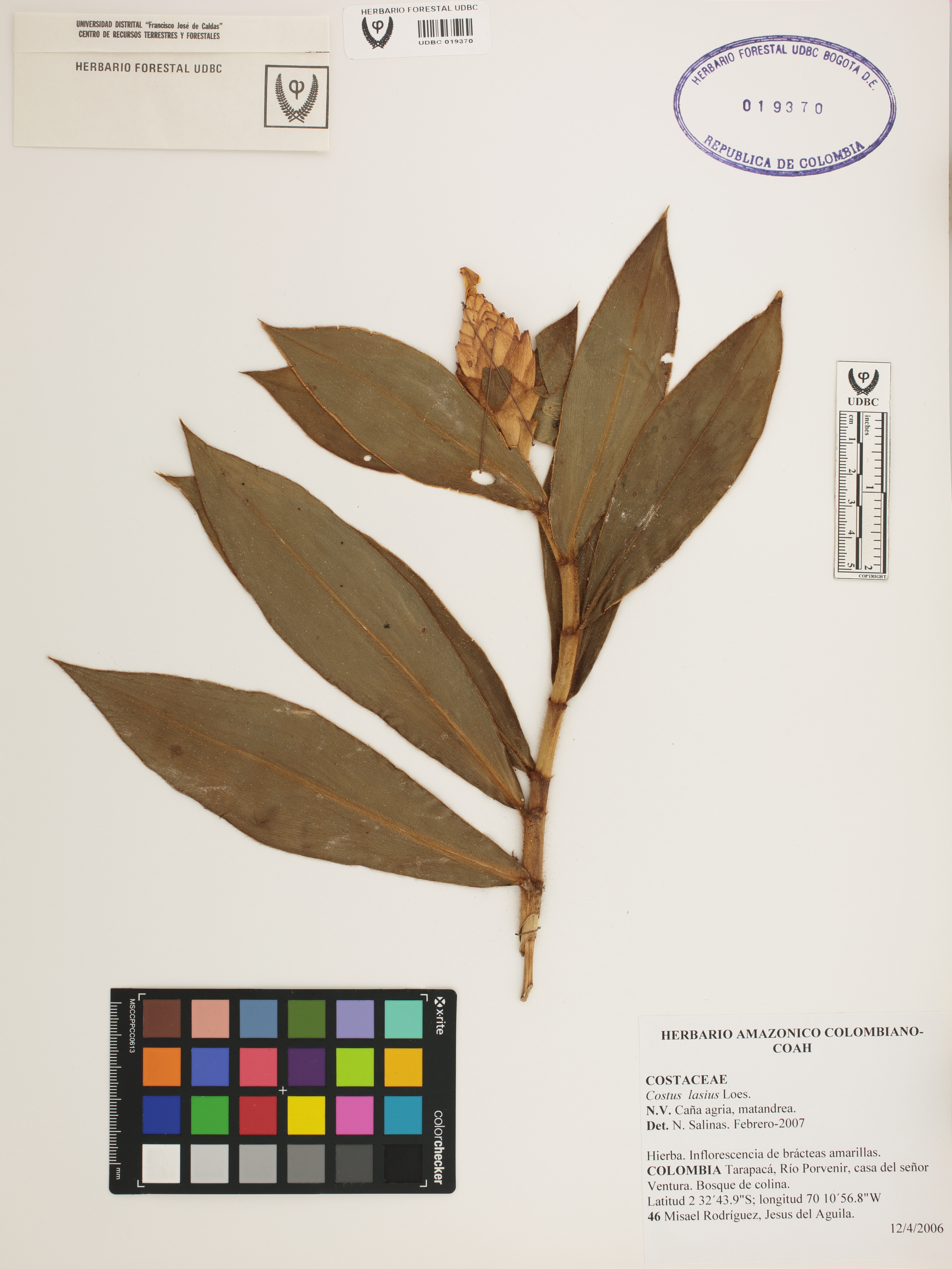 Fotografía del ejemplar Rodríguez, M. 46, determinado como Costus lasius en el año 2007