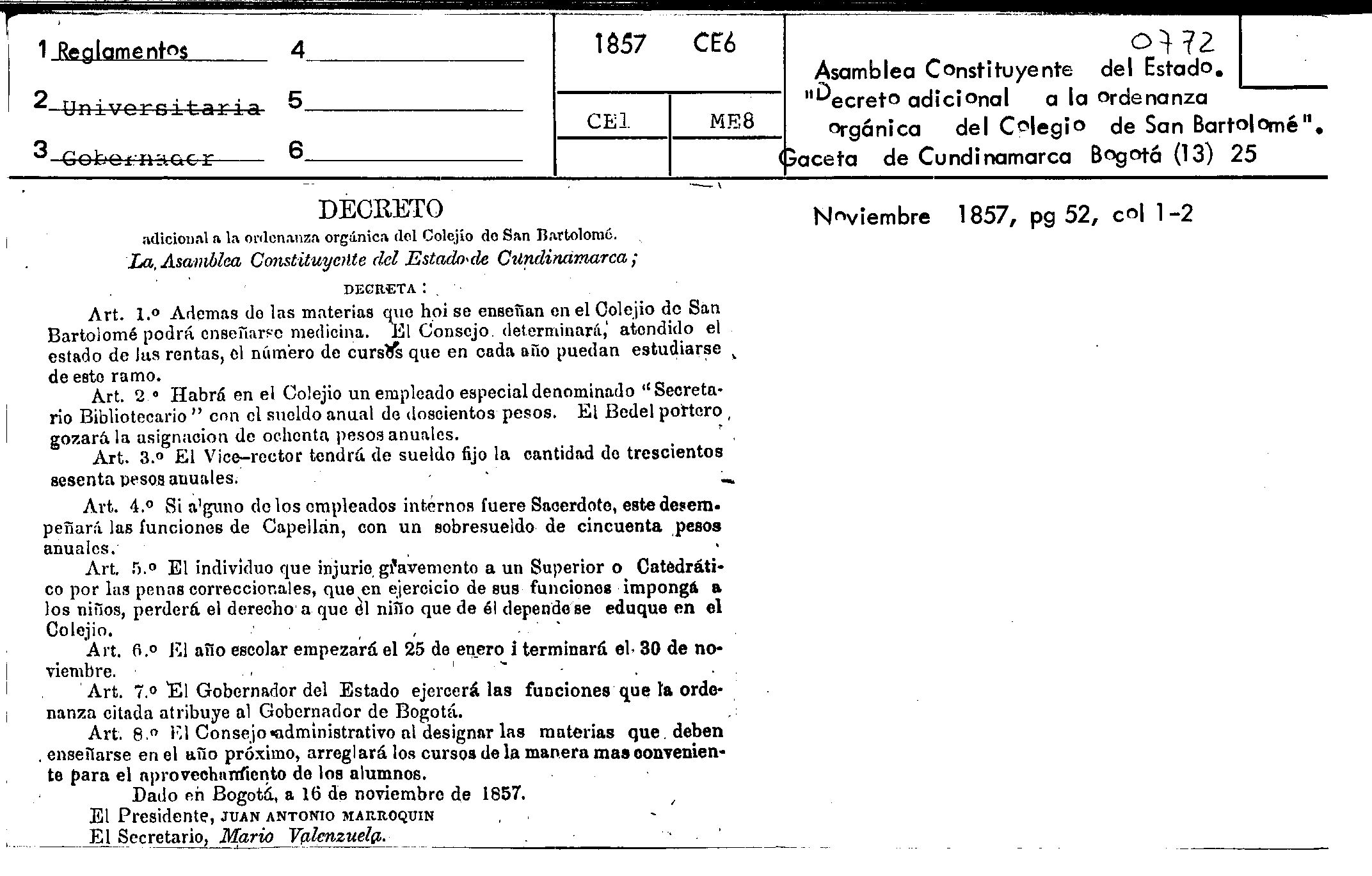 Reglamentos, Decreto, Medicina, Colejio de San Bartolomé, Noticia de Bogota