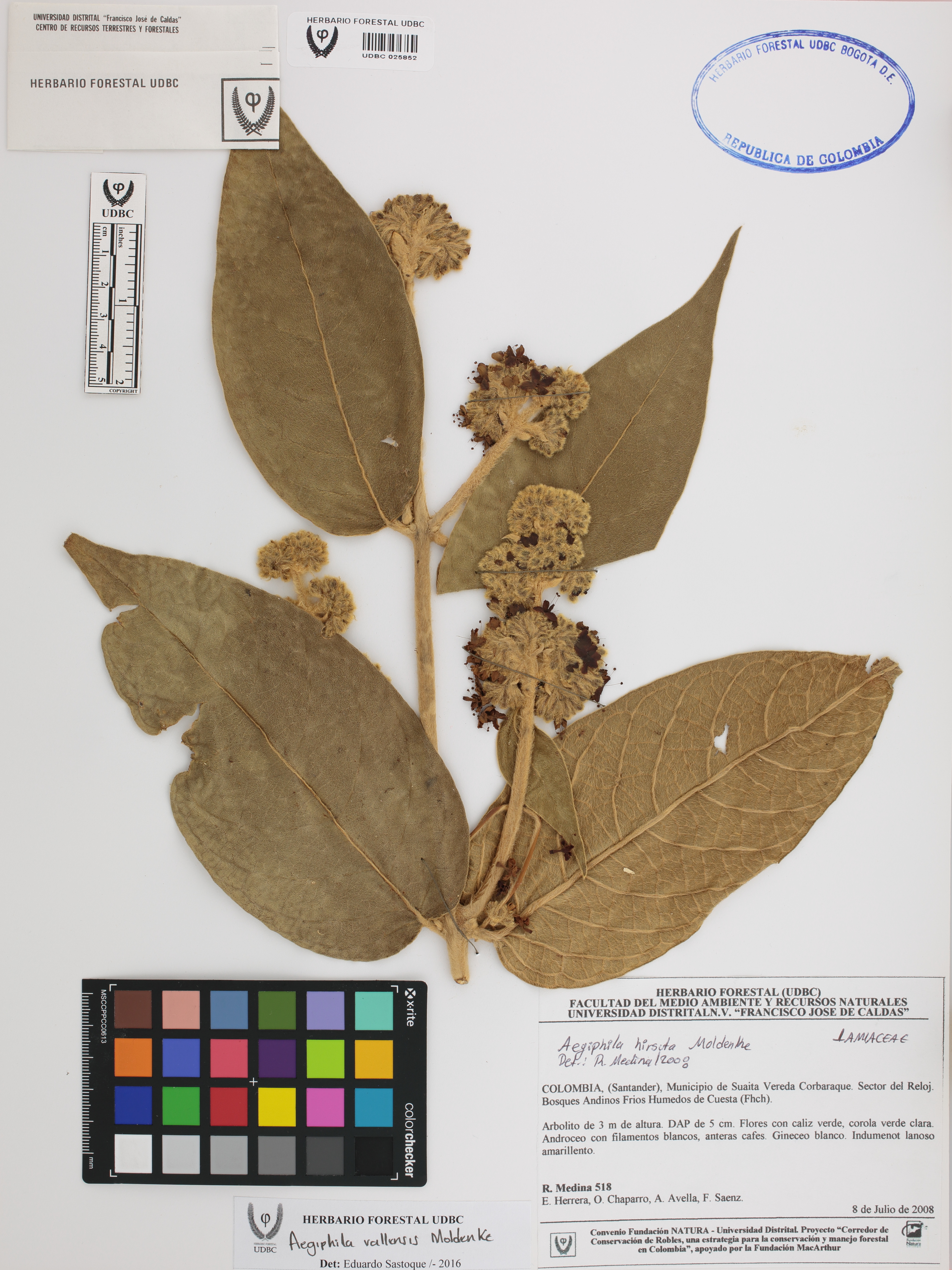 Fotografía del ejemplar Medina, R. 518, determinado como Aegiphila vallensis en el año 2016