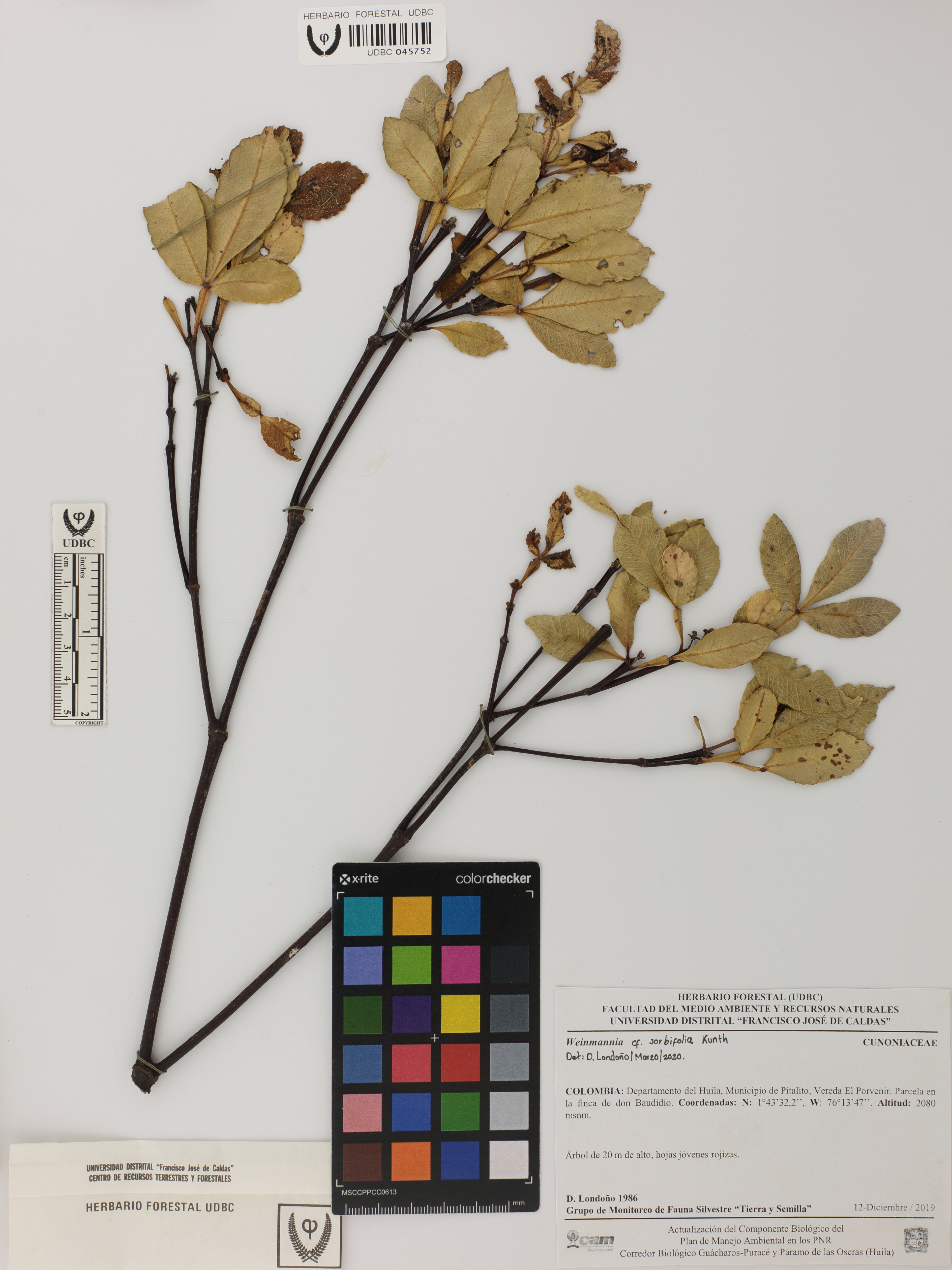 Fotografía del ejemplar Londoño, D. 1986, determinado como Weinmannia sorbifolia en el año 2020