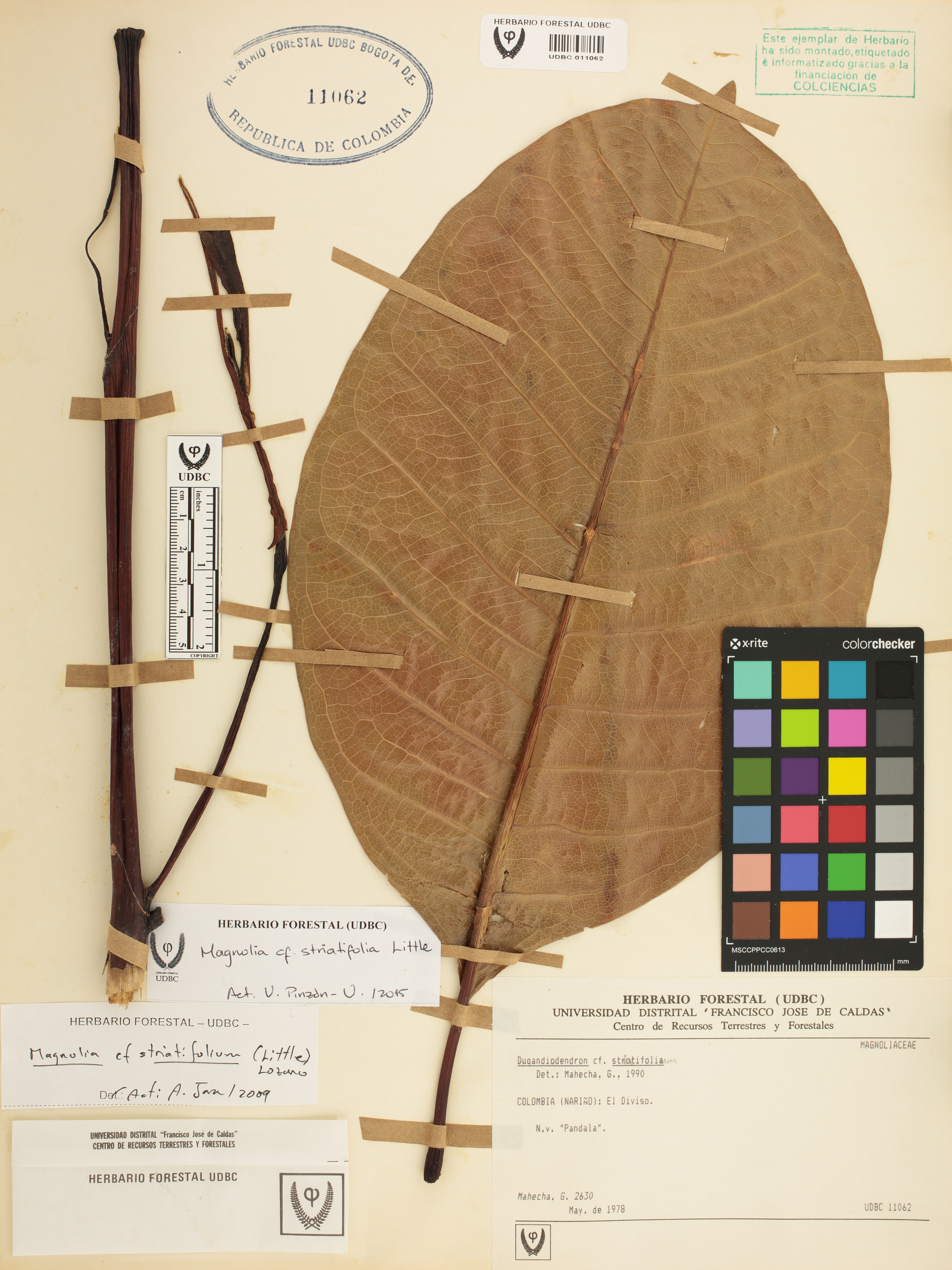 Fotografía del ejemplar Mahecha, G. 2630, determinado como Magnolia striatifolia en el año 1990