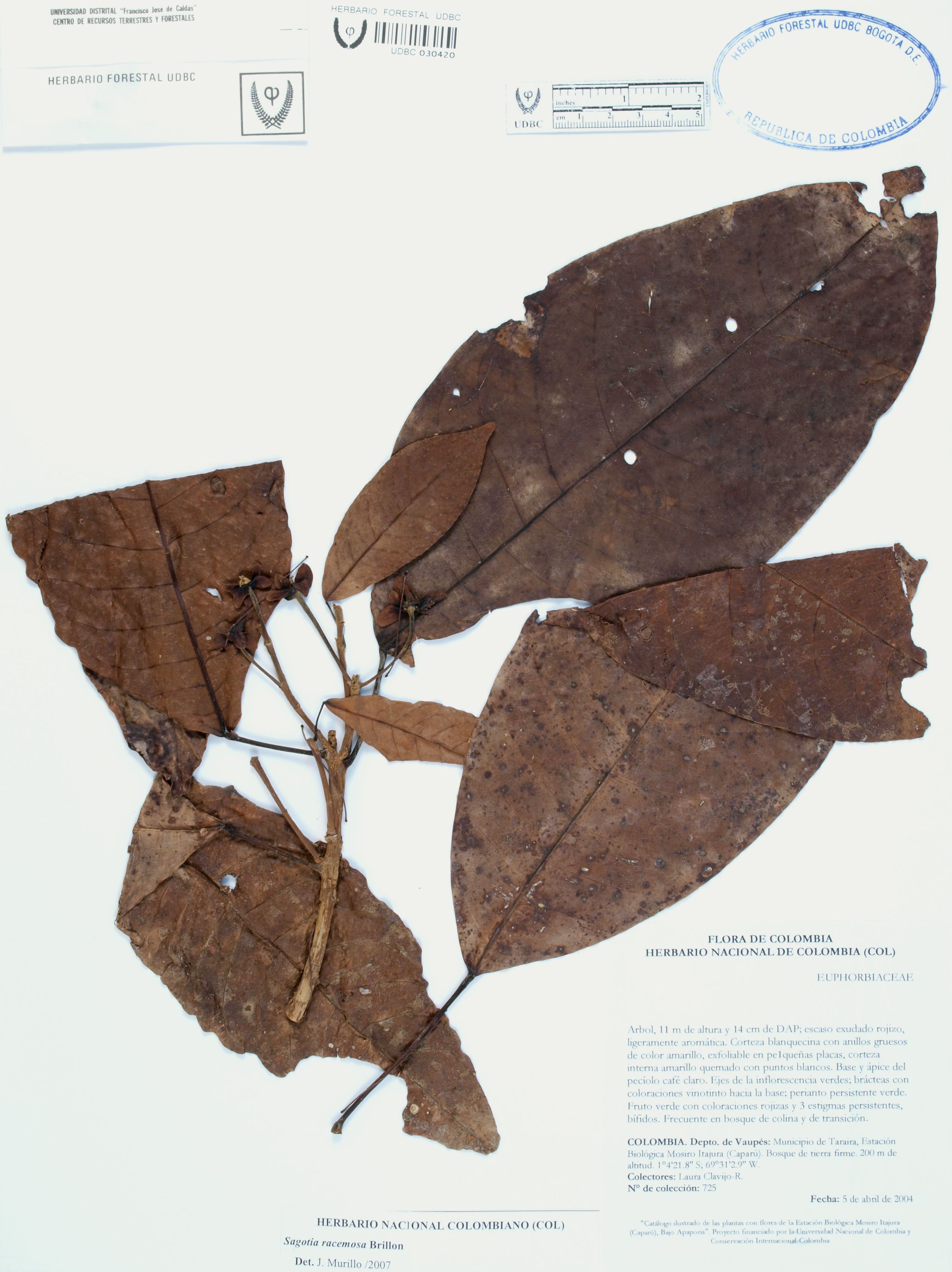 Fotografía del ejemplar Clavijo-R., L. 725, determinado como Sagotia racemosa en el año 2007