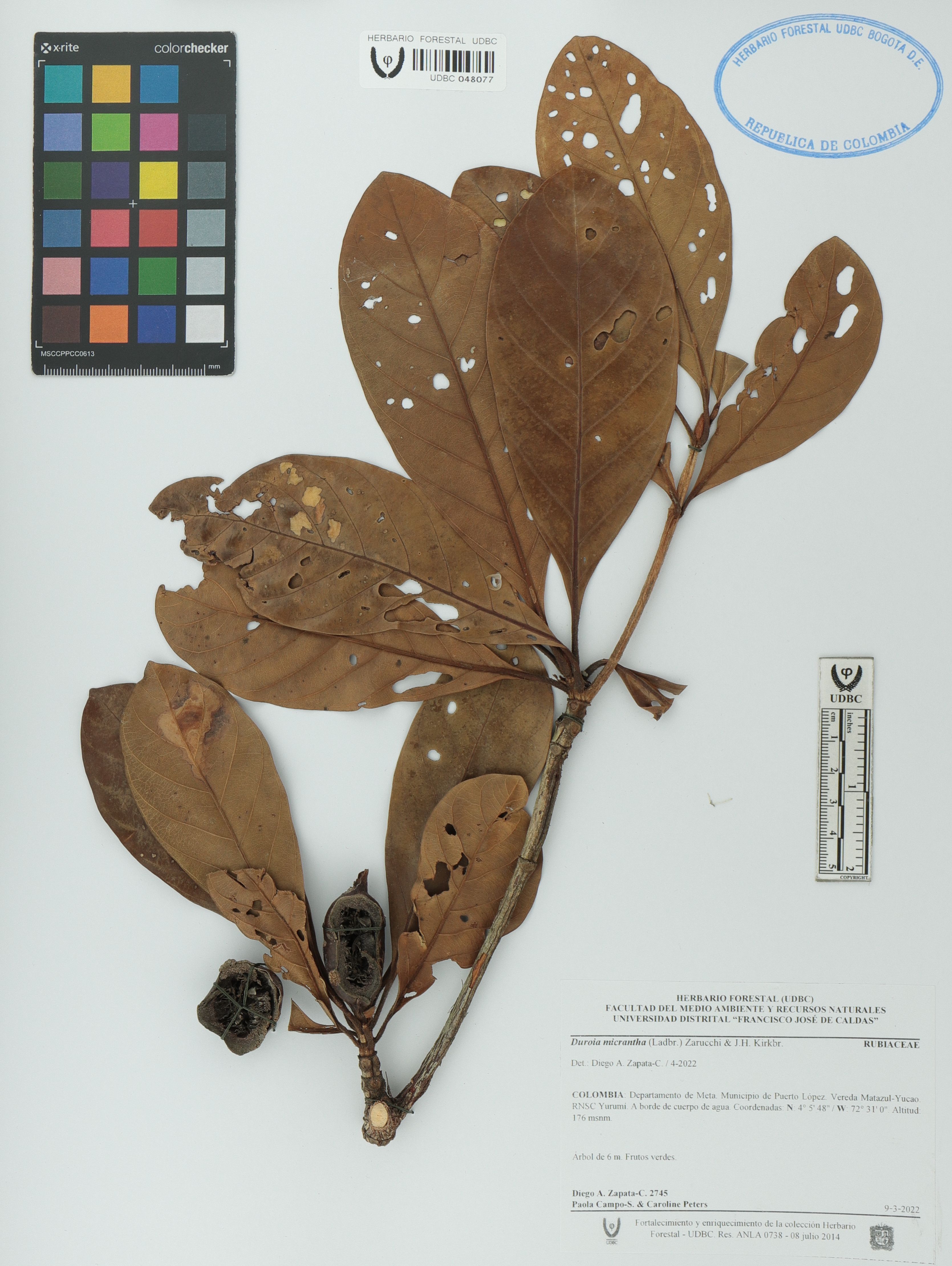 Fotografía del ejemplar Zapata-C., Diego 2745, determinado como Duroia micrantha en el año 2022