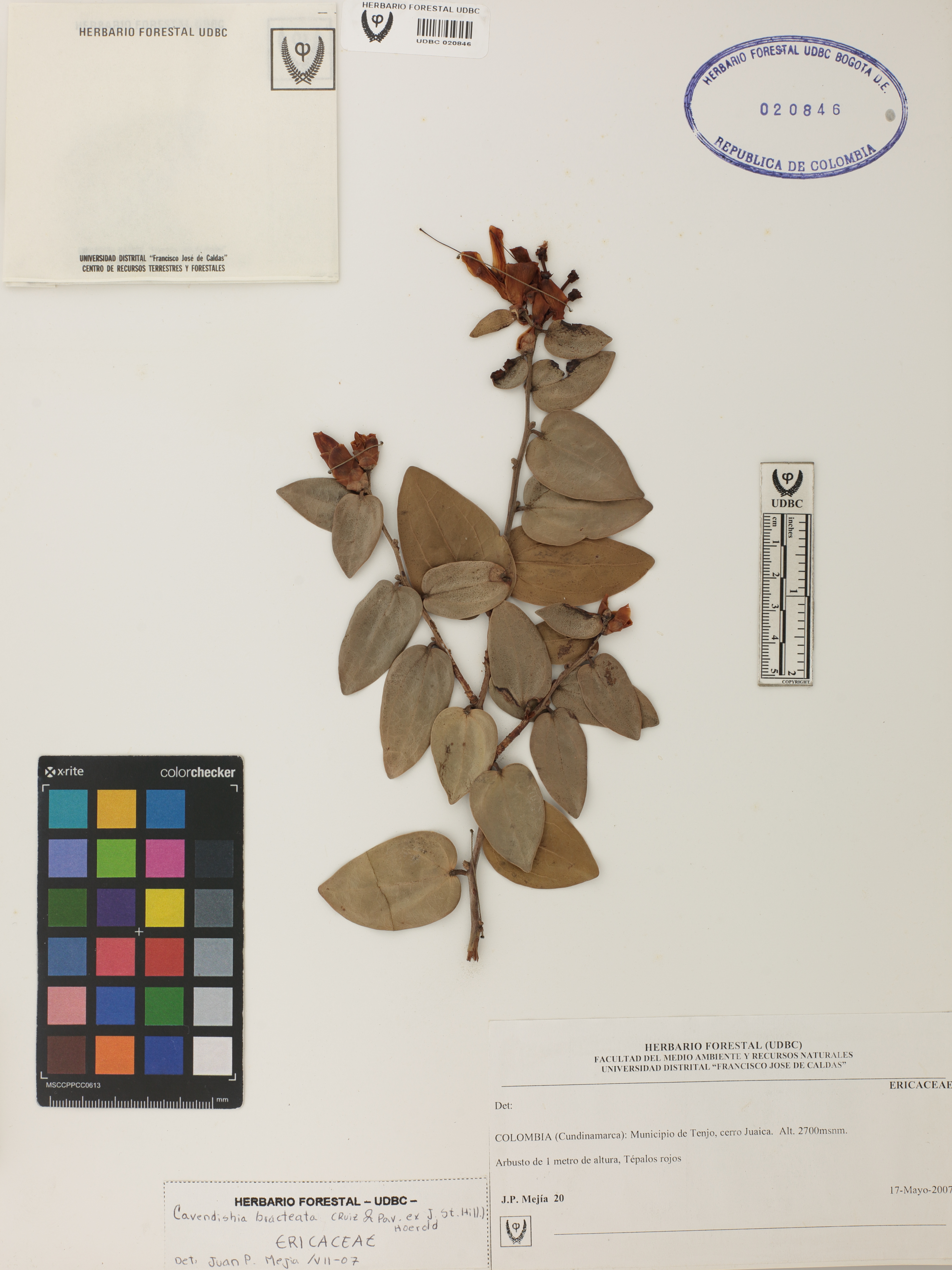 Fotografía del ejemplar Mejía, J. 20, determinado como Cavendishia bracteata en el año 2007