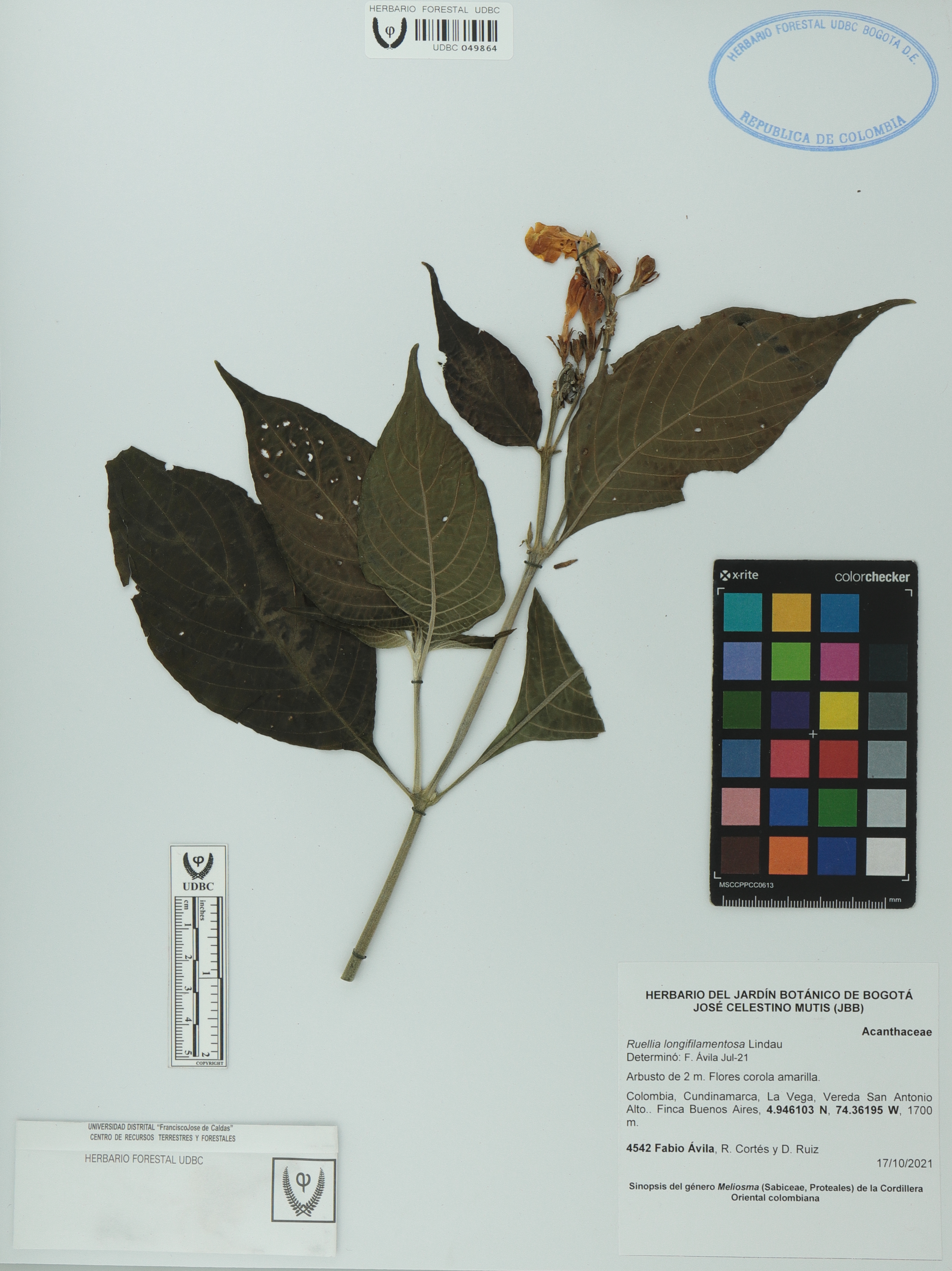 Fotografía del ejemplar Ávila, F. 4542, determinado como Ruellia longifilamentosa en el año 2021