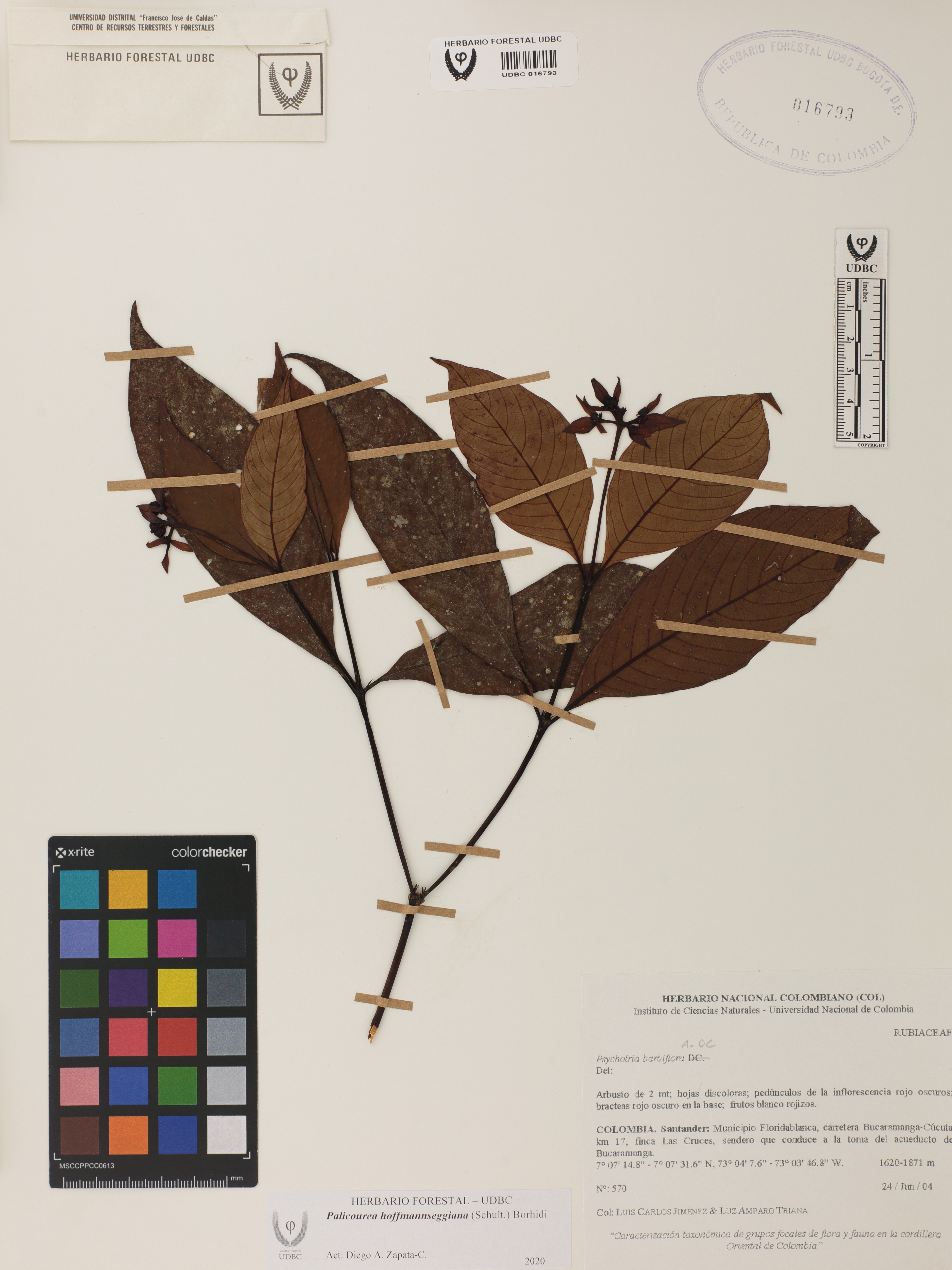 Fotografía del ejemplar Jiménez, L. 570, determinado como Palicourea hoffmannseggiana en el año 2020