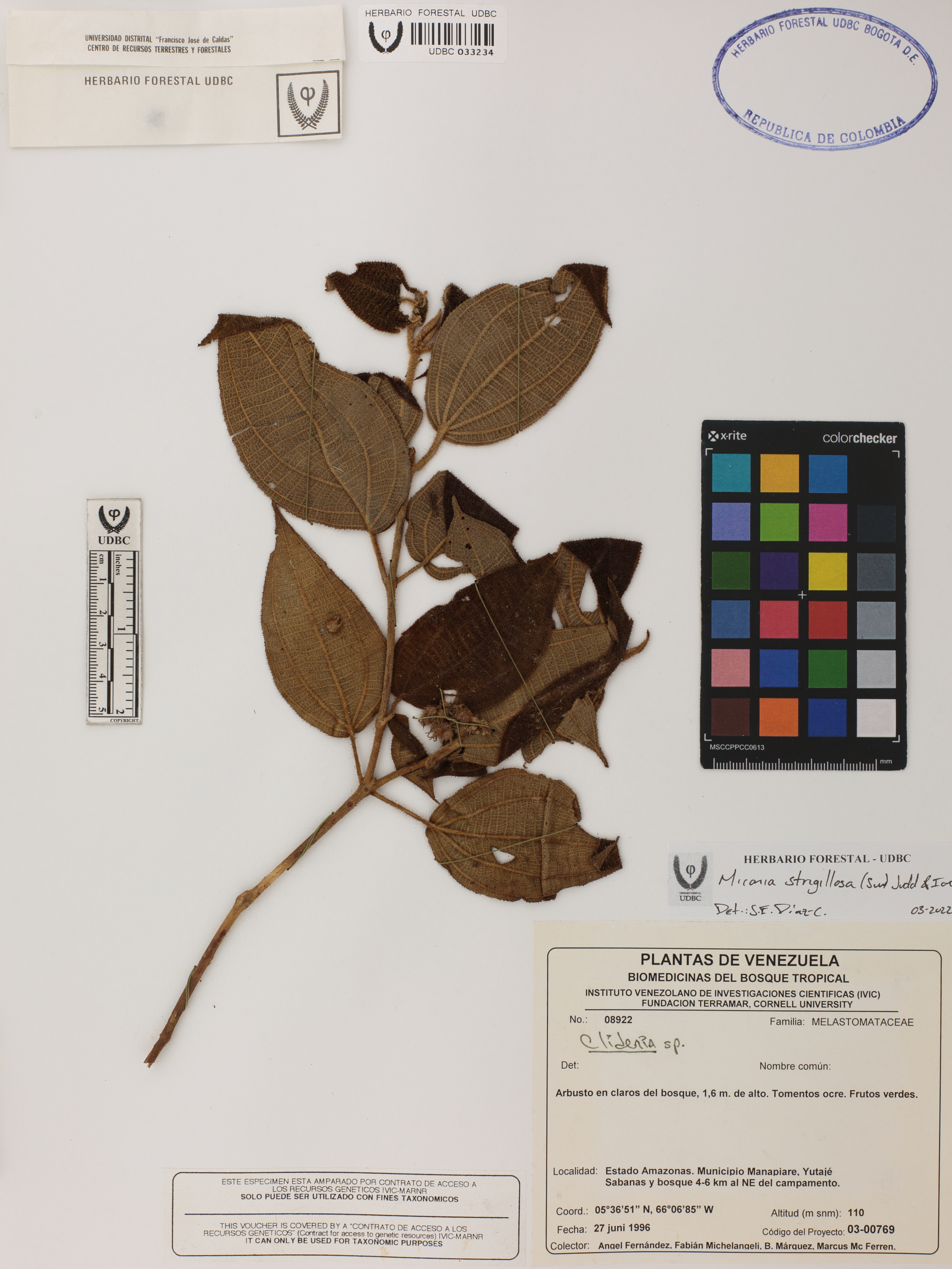 Fotografía del ejemplar Fernández, A. 8922, determinado como Miconia strigillosa en el año 2022