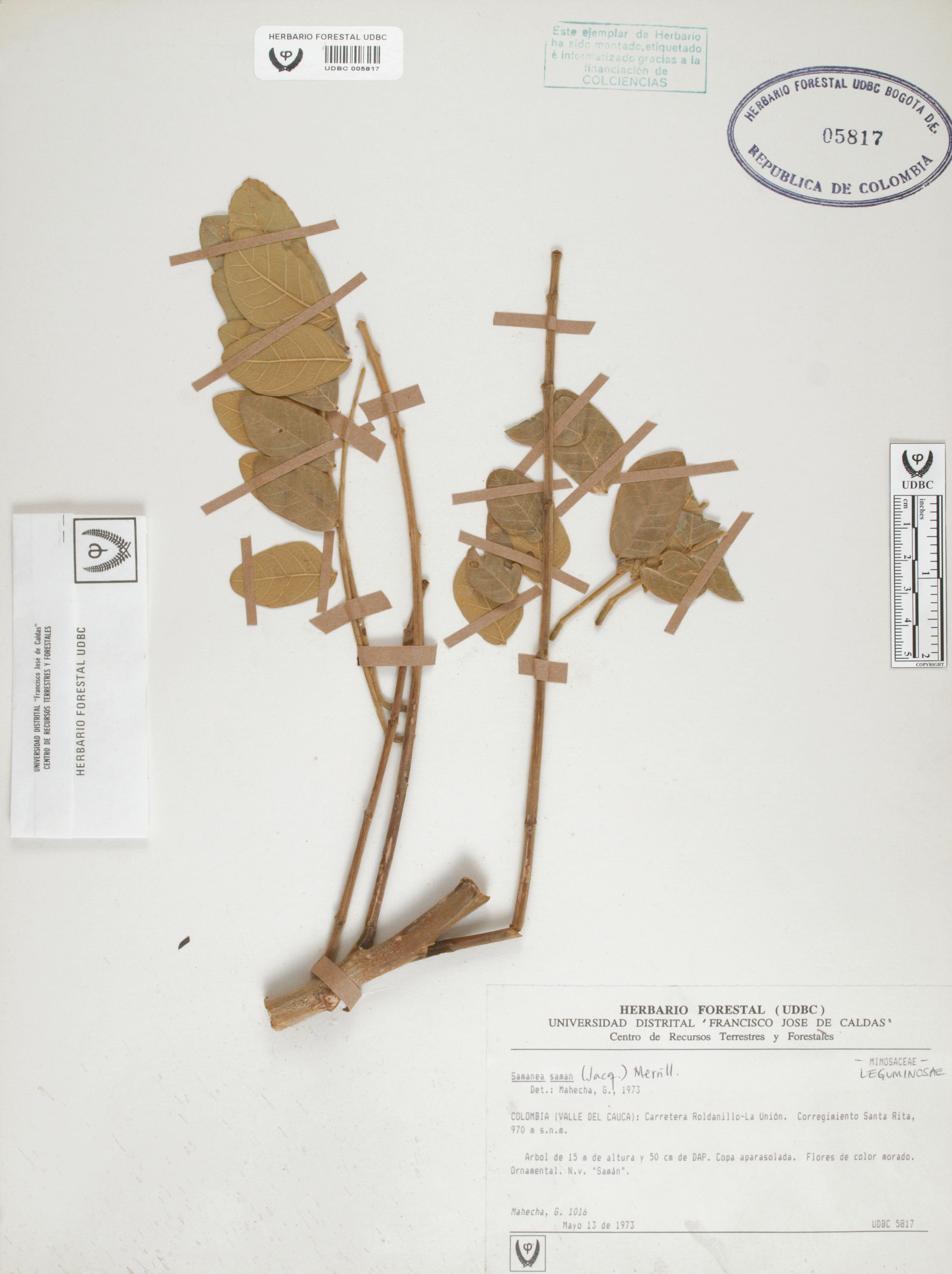 Fotografía del ejemplar Mahecha, G. 1016, determinado como Samanea saman en el año 1973