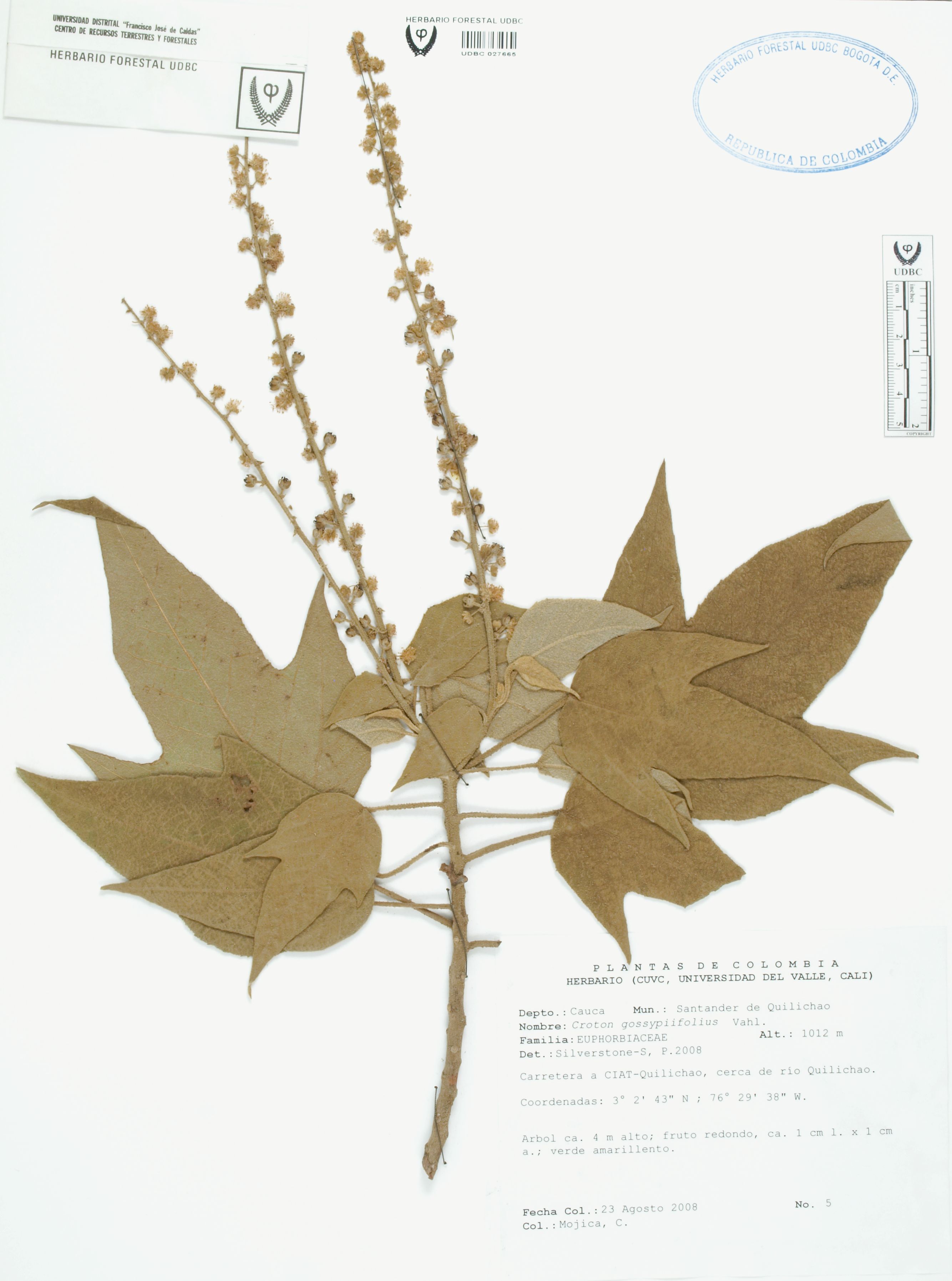 Fotografía del ejemplar Mojica, C. 5, determinado como Croton gossypiifolius en el año 2008