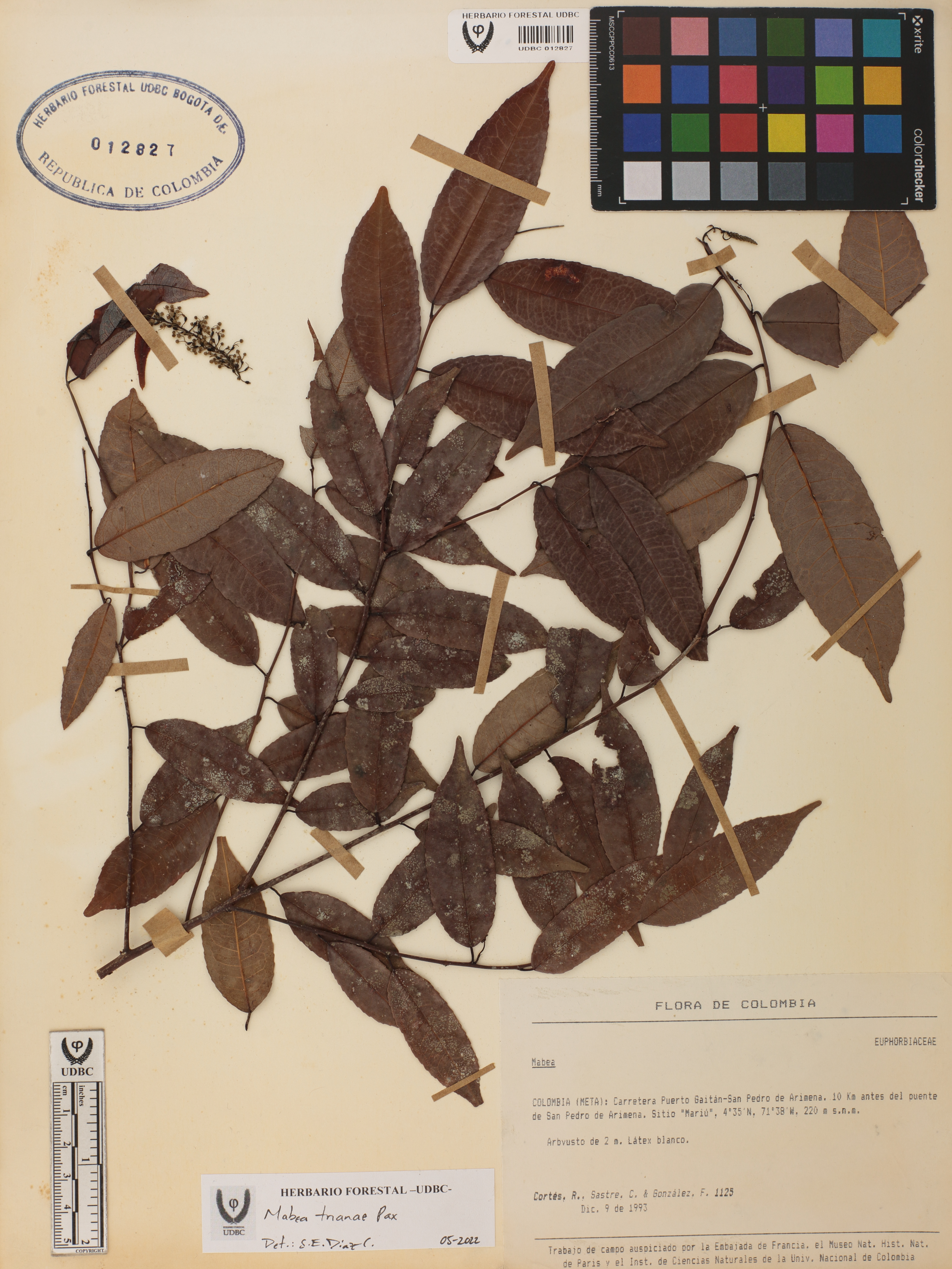 Fotografía del ejemplar Cortés-B., R. 1125, determinado como Mabea trianae en el año 2022