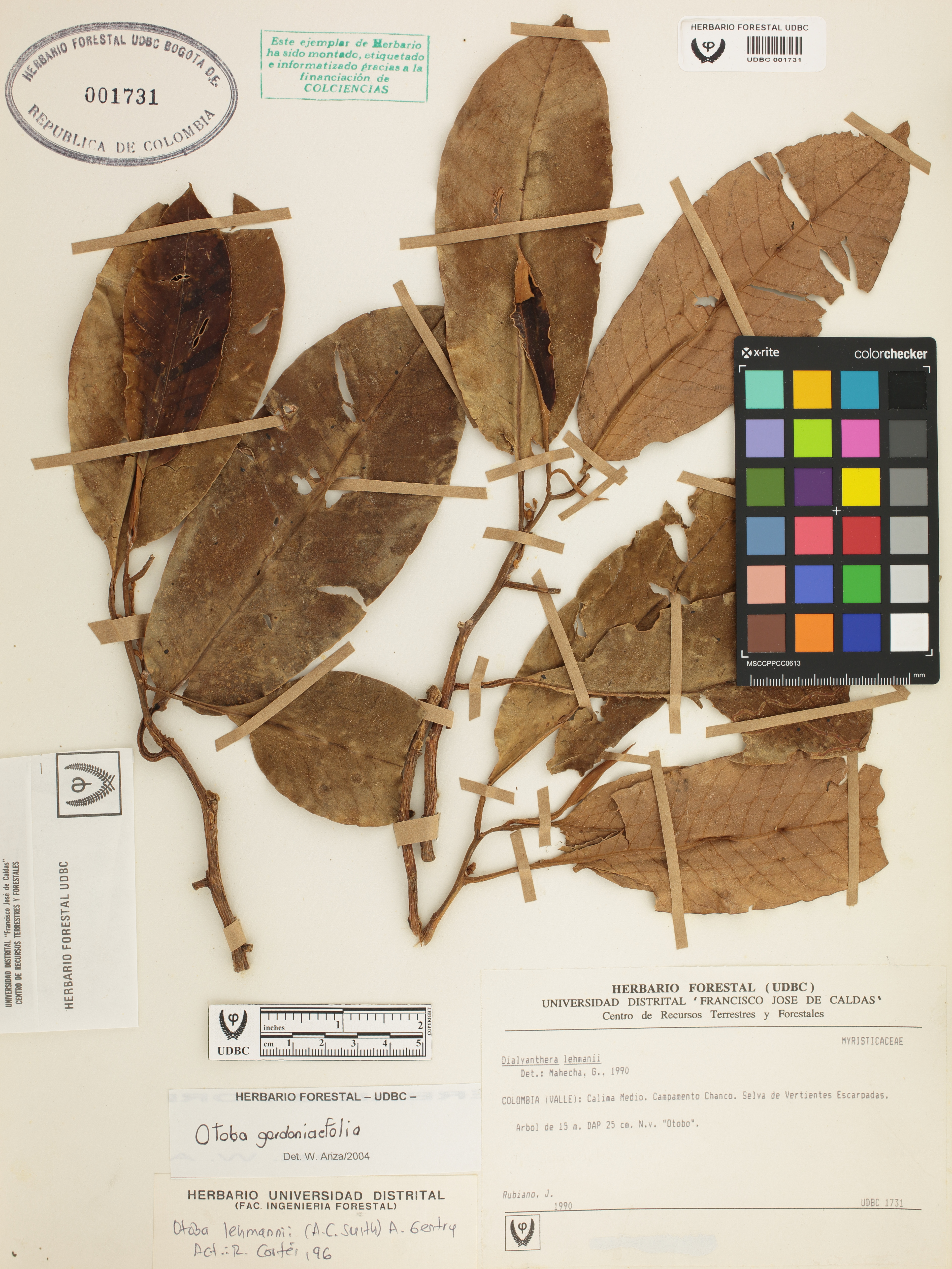 Fotografía del ejemplar Rubiano, J., determinado como Otoba gordoniifolia en el año 2004
