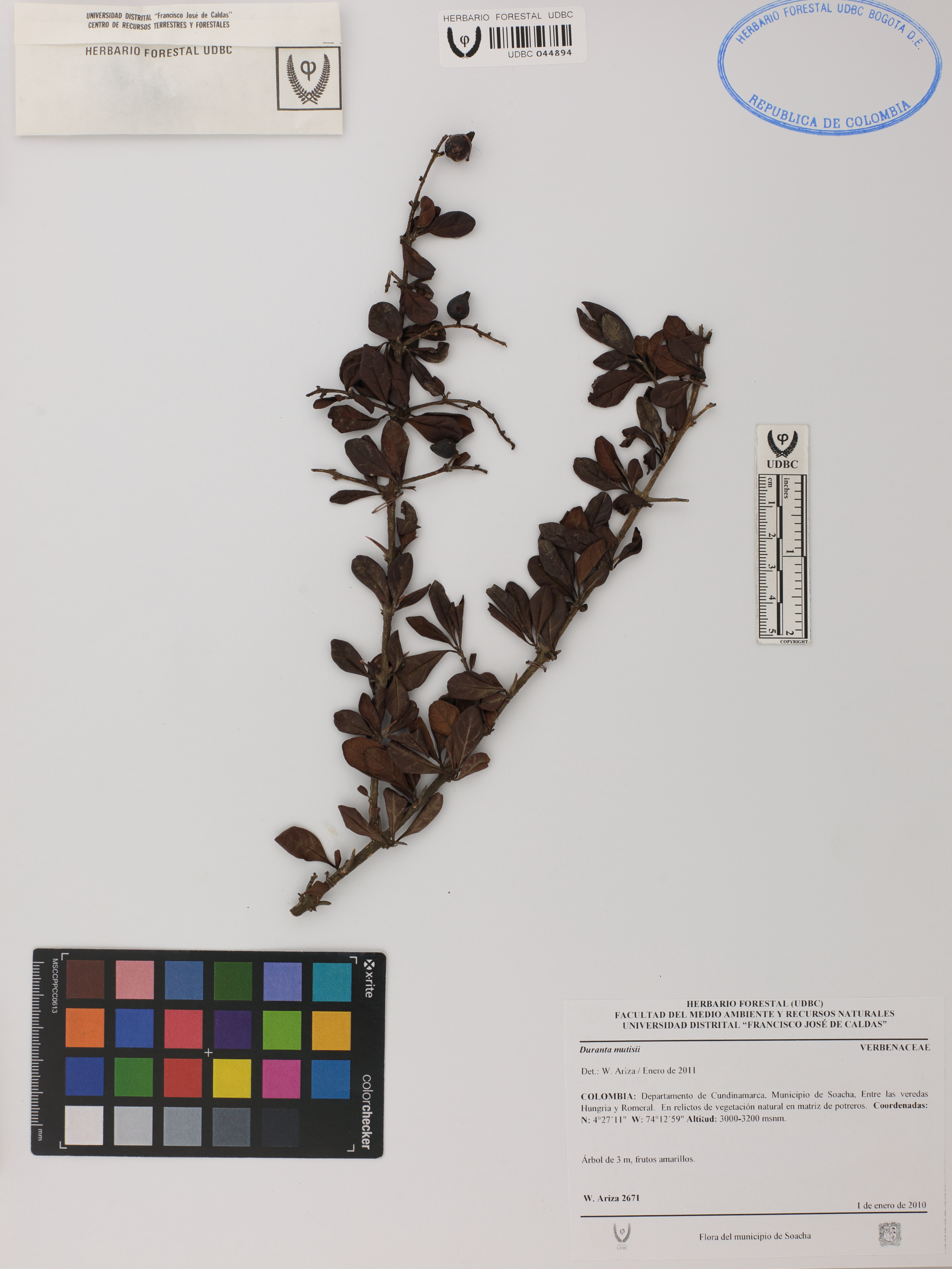 Fotografía del ejemplar Ariza-Cortés, W. 2671, determinado como Duranta mutisii en el año 2011