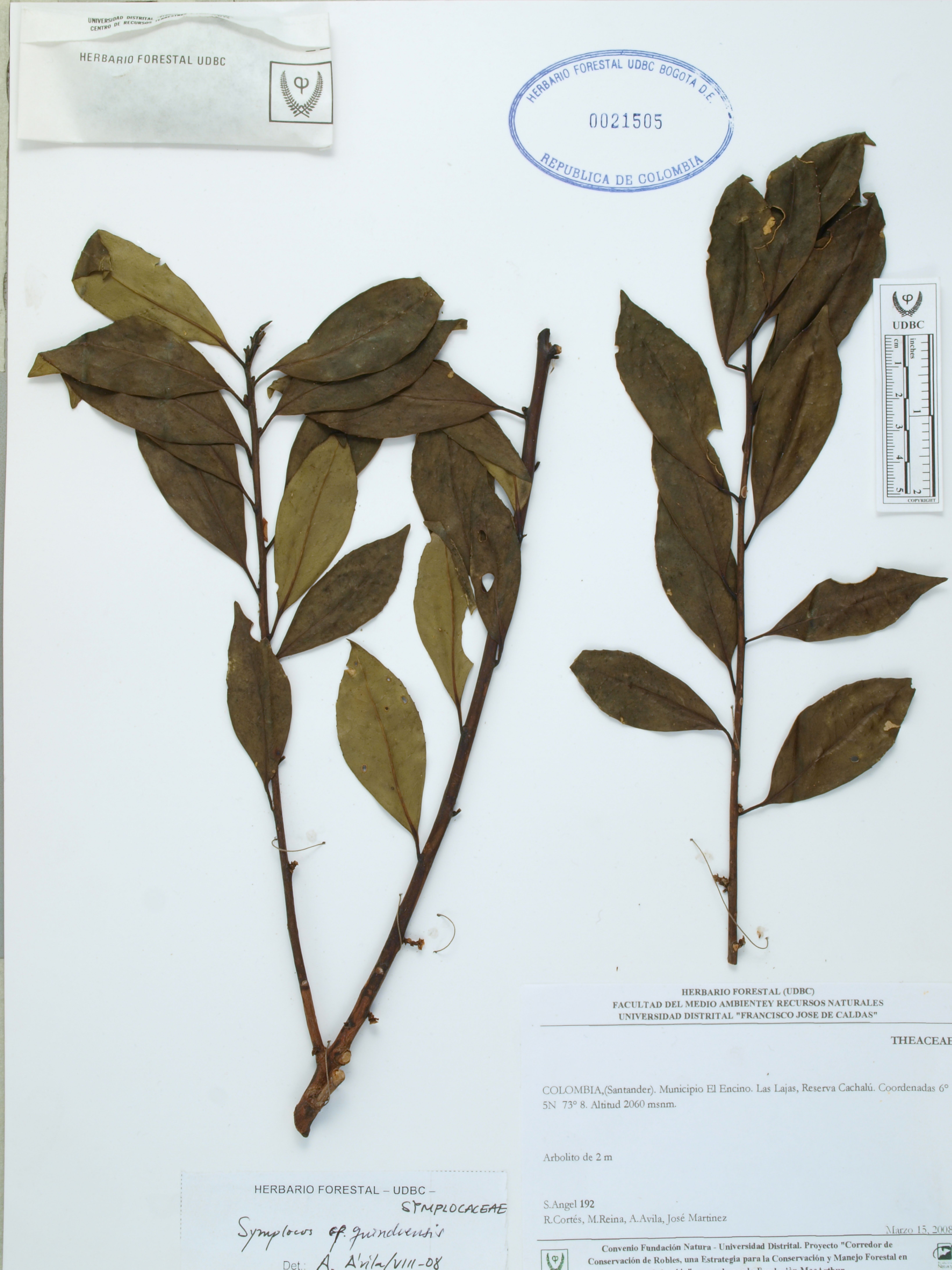 Fotografía del ejemplar Ángel, S. 192, determinado como Symplocos quindiuensis en el año 2008