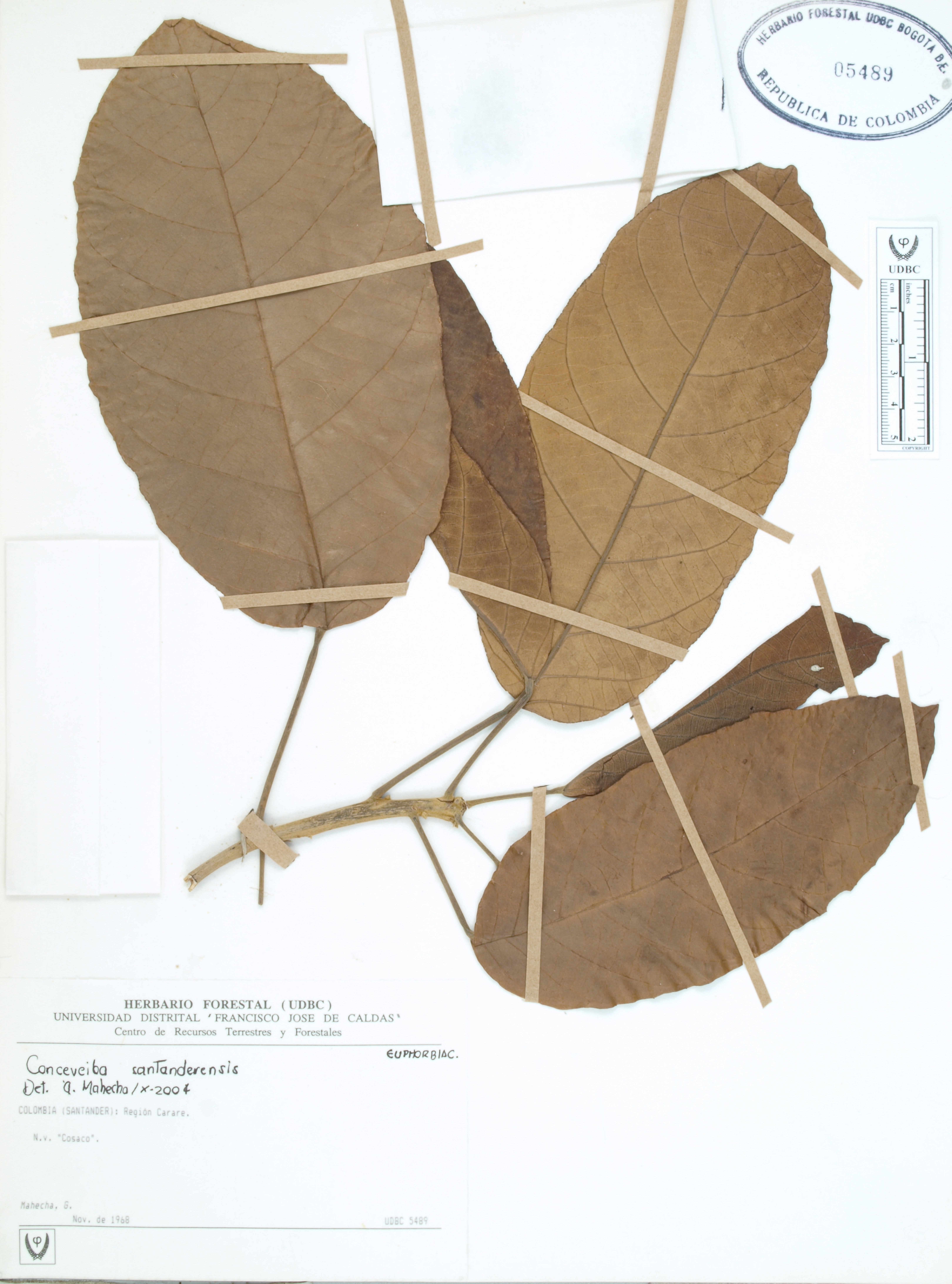 Fotografía del ejemplar Mahecha, G., determinado como Conceveiba santanderensis en el año 2004