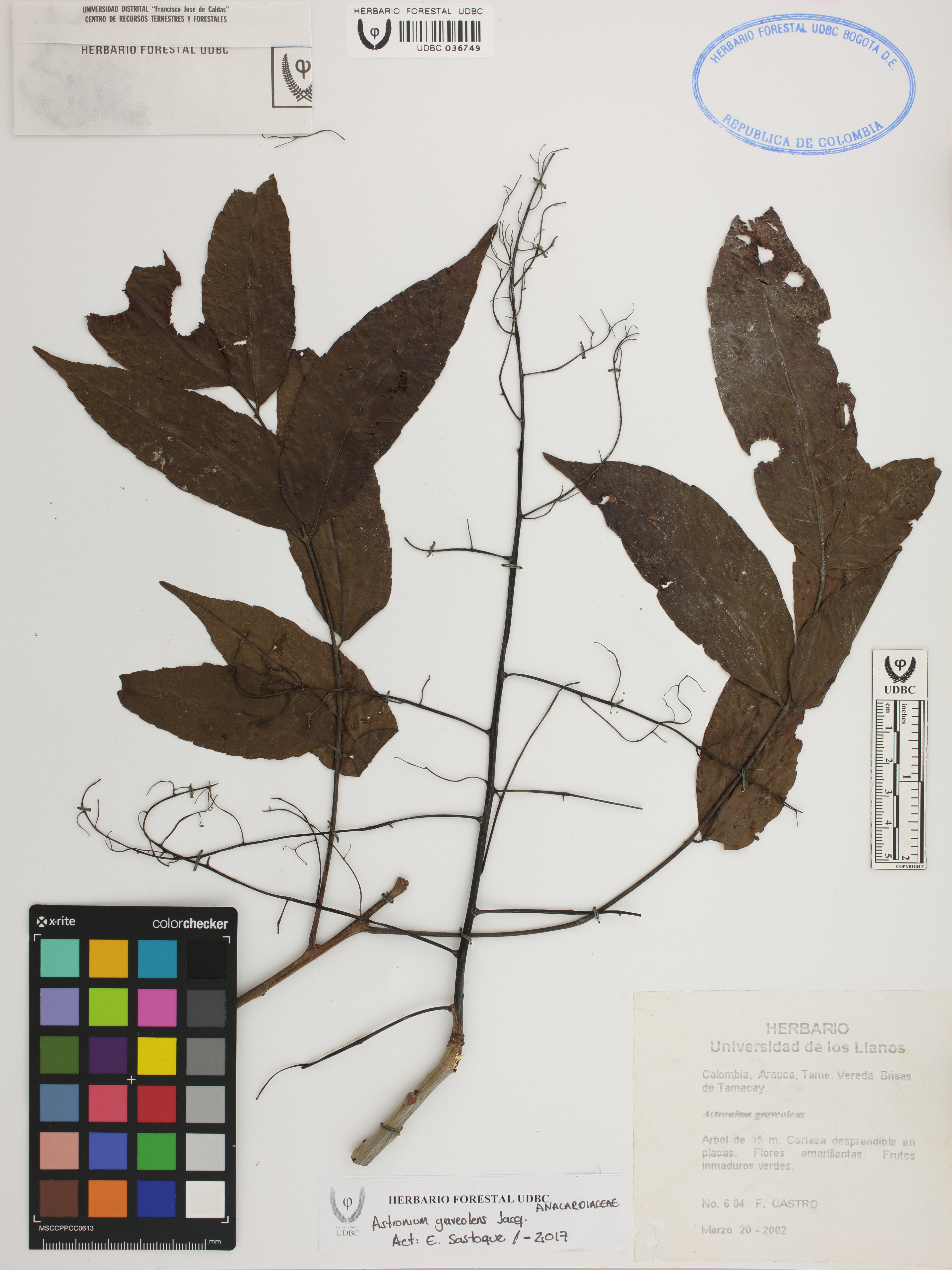 Fotografía del ejemplar Castro, F. 604, determinado como Astronium graveolens en el año 2017