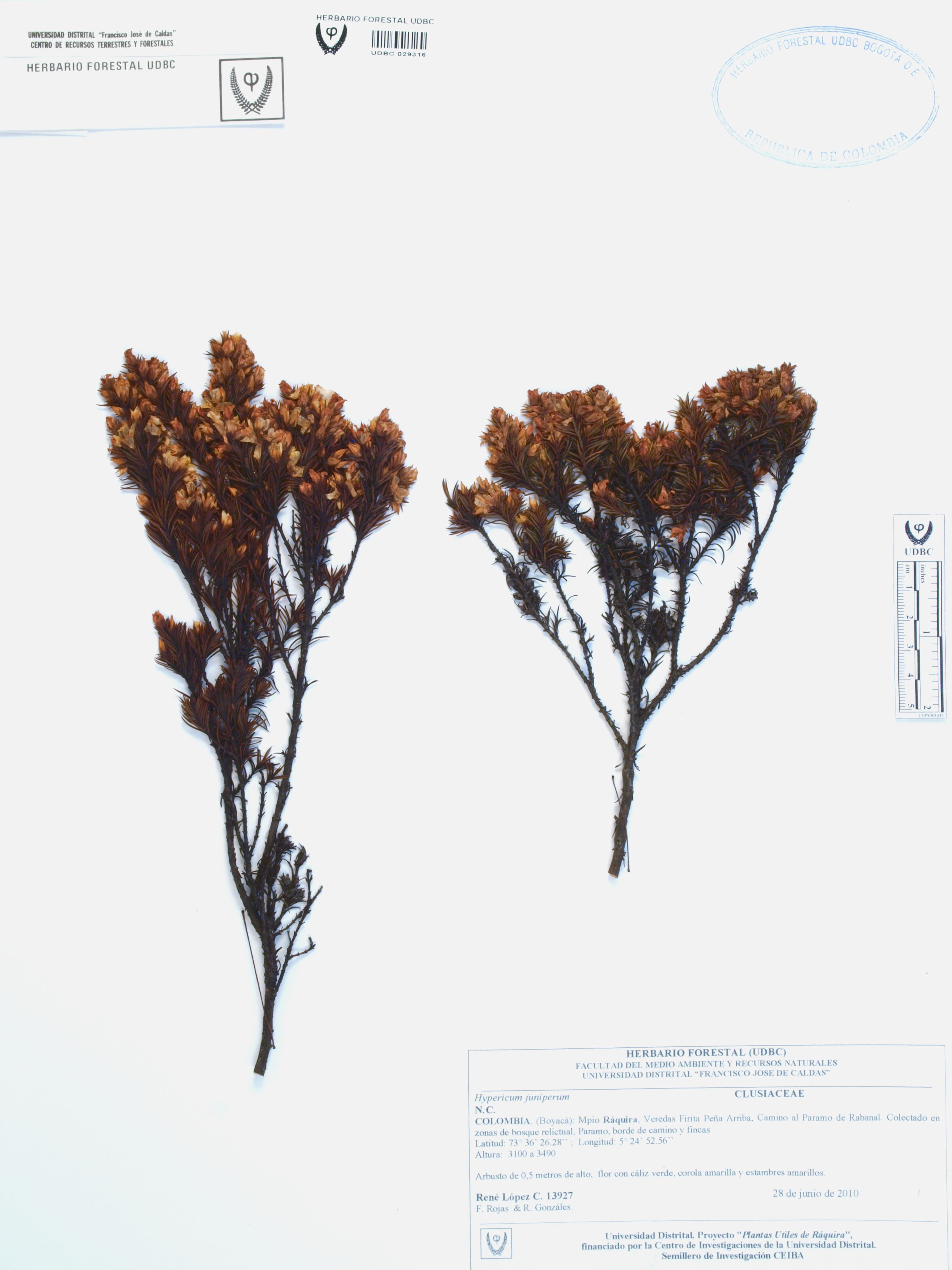 Fotografía del ejemplar López, R. 13927, determinado como Hypericum juniperinum