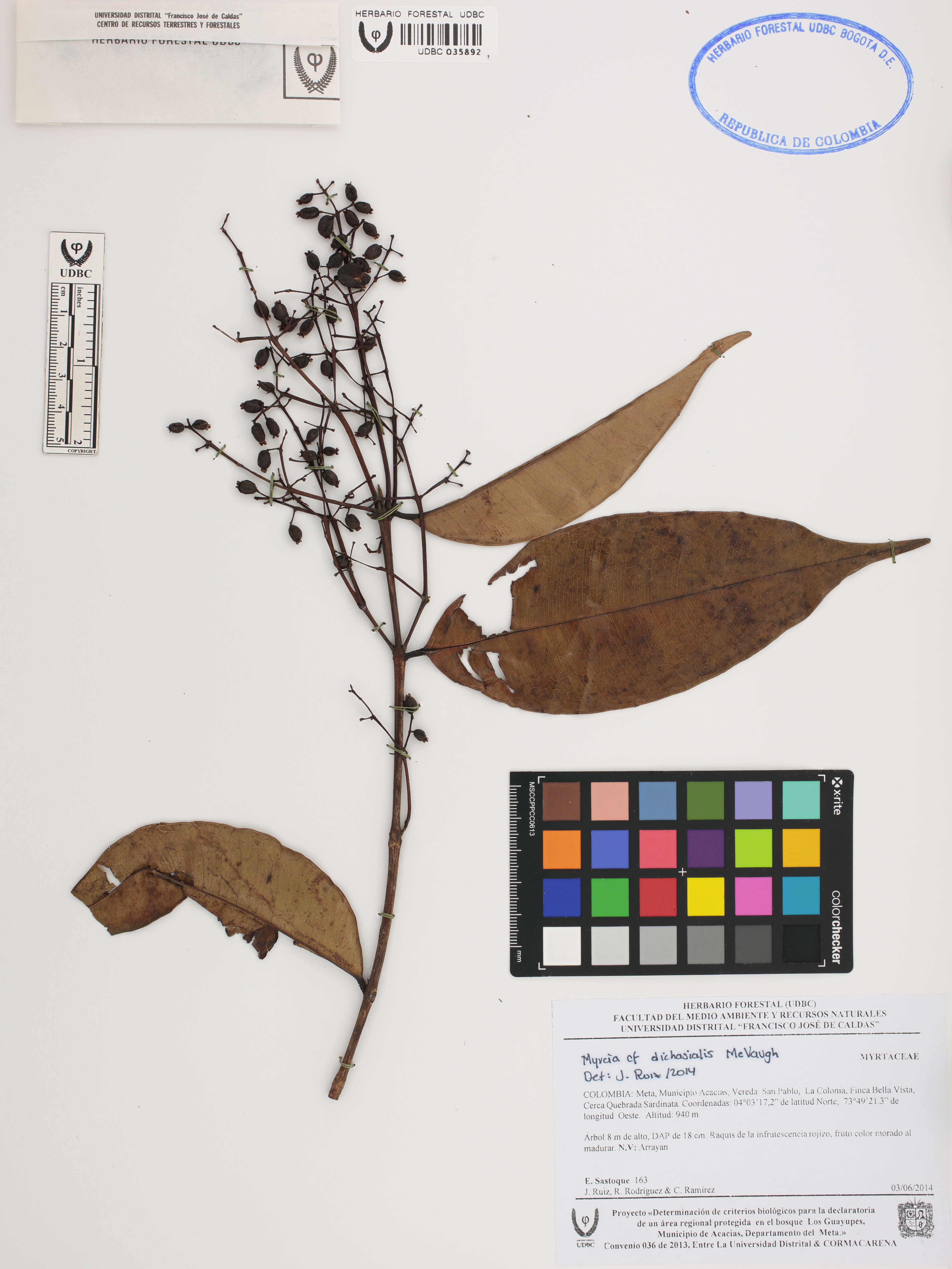 Fotografía del ejemplar Sastoque, E. 163, determinado como Myrcia dichasialis en el año 2014
