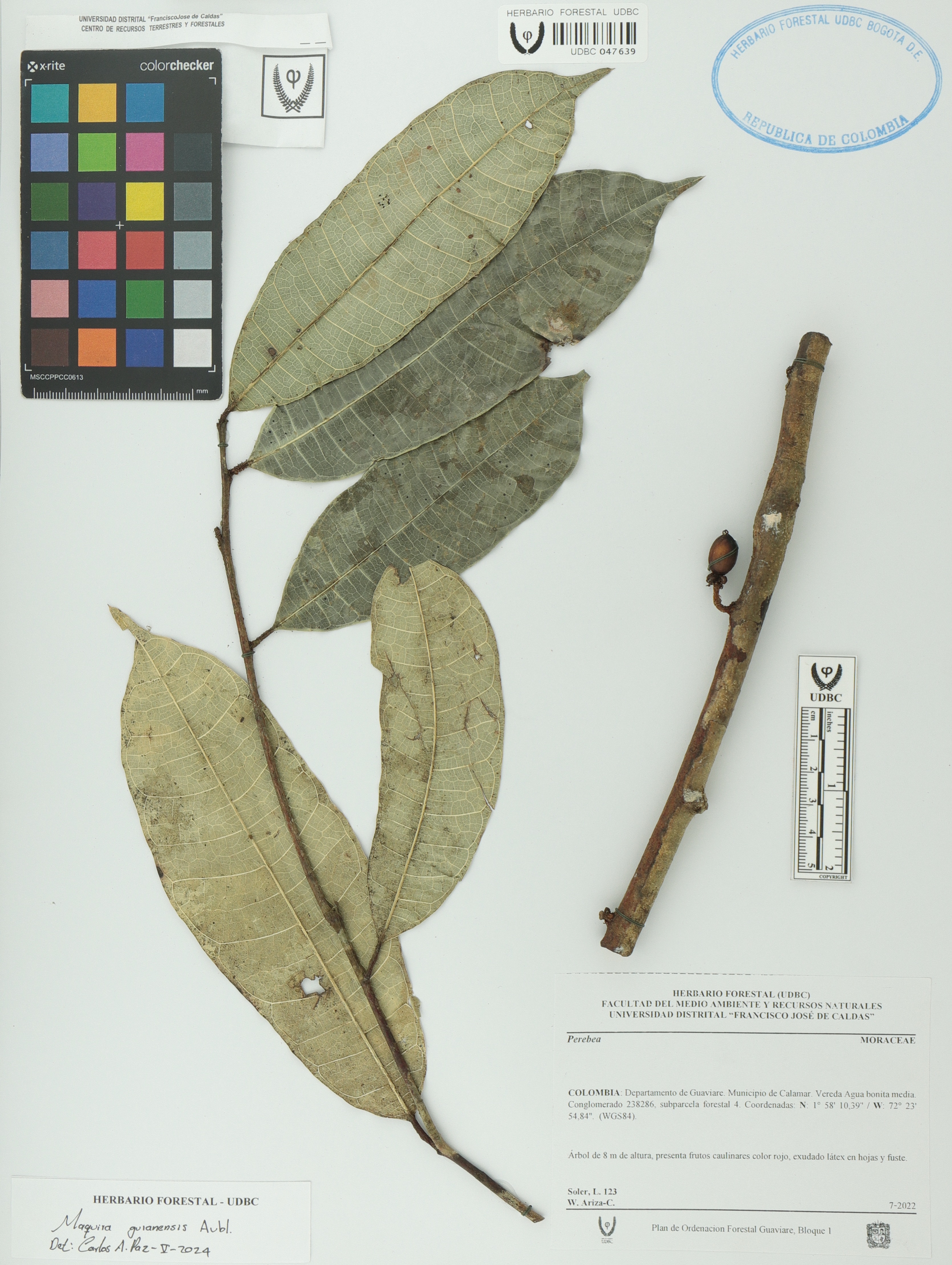 Fotografía del ejemplar Soler, L. 123, determinado como Maquira guianensis en el año 2024