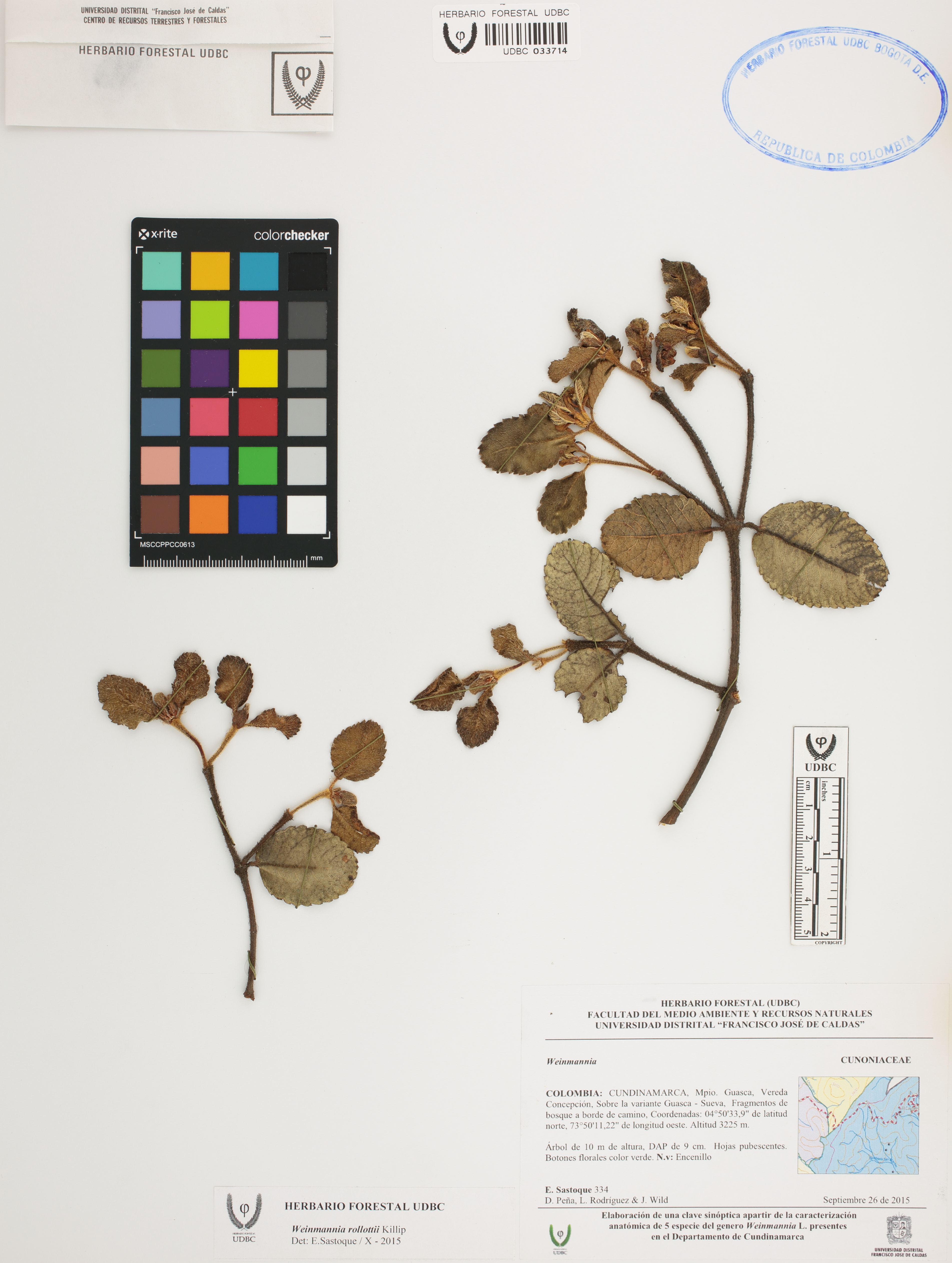 | dc.description | Fotografía del ejemplar Sastoque, E. 334, determinado como Weinmannia rollottii en el año 2015 | |