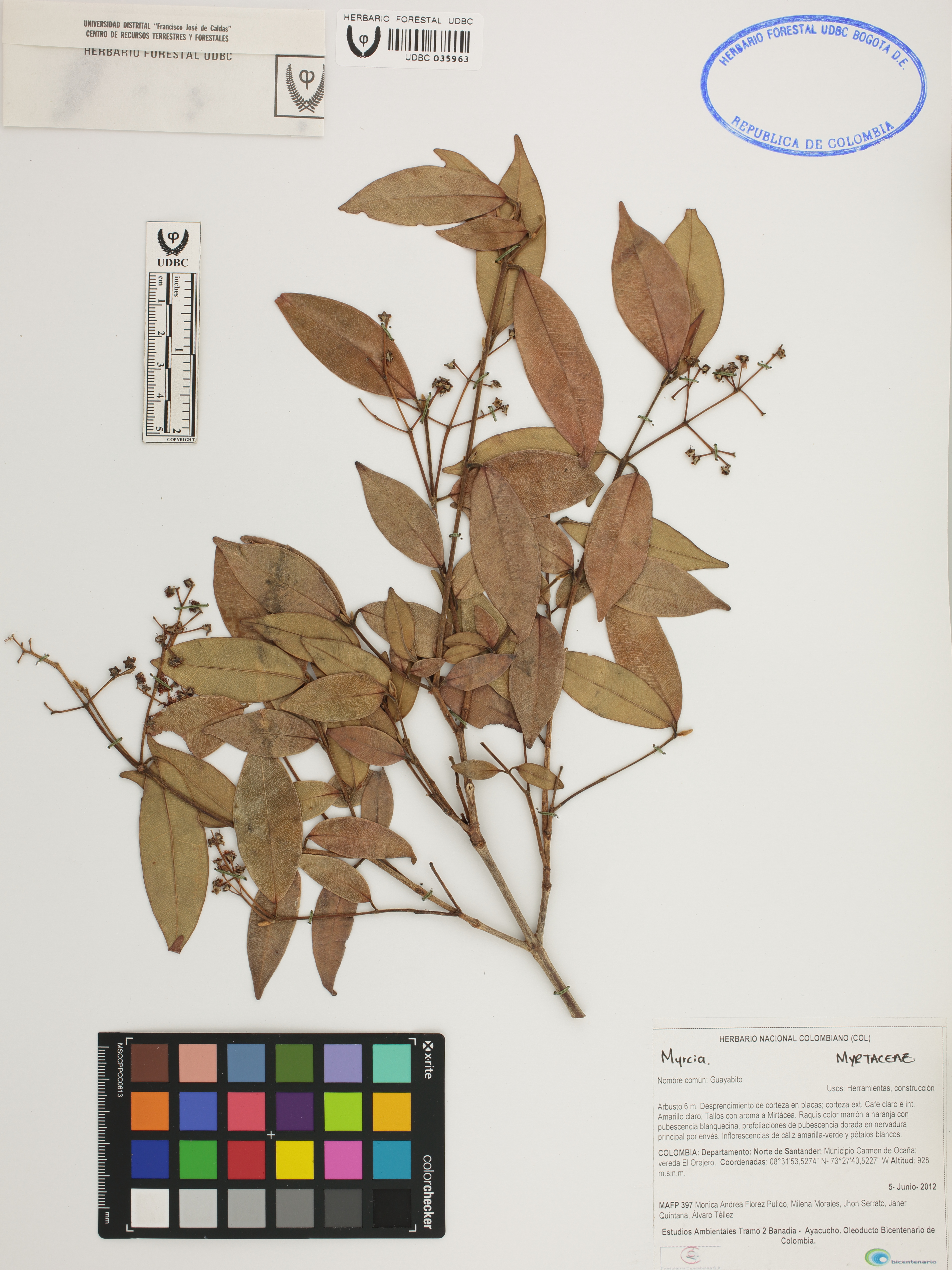 Fotografía del ejemplar Flórez, M. 397, determinado como Myrcia sp.