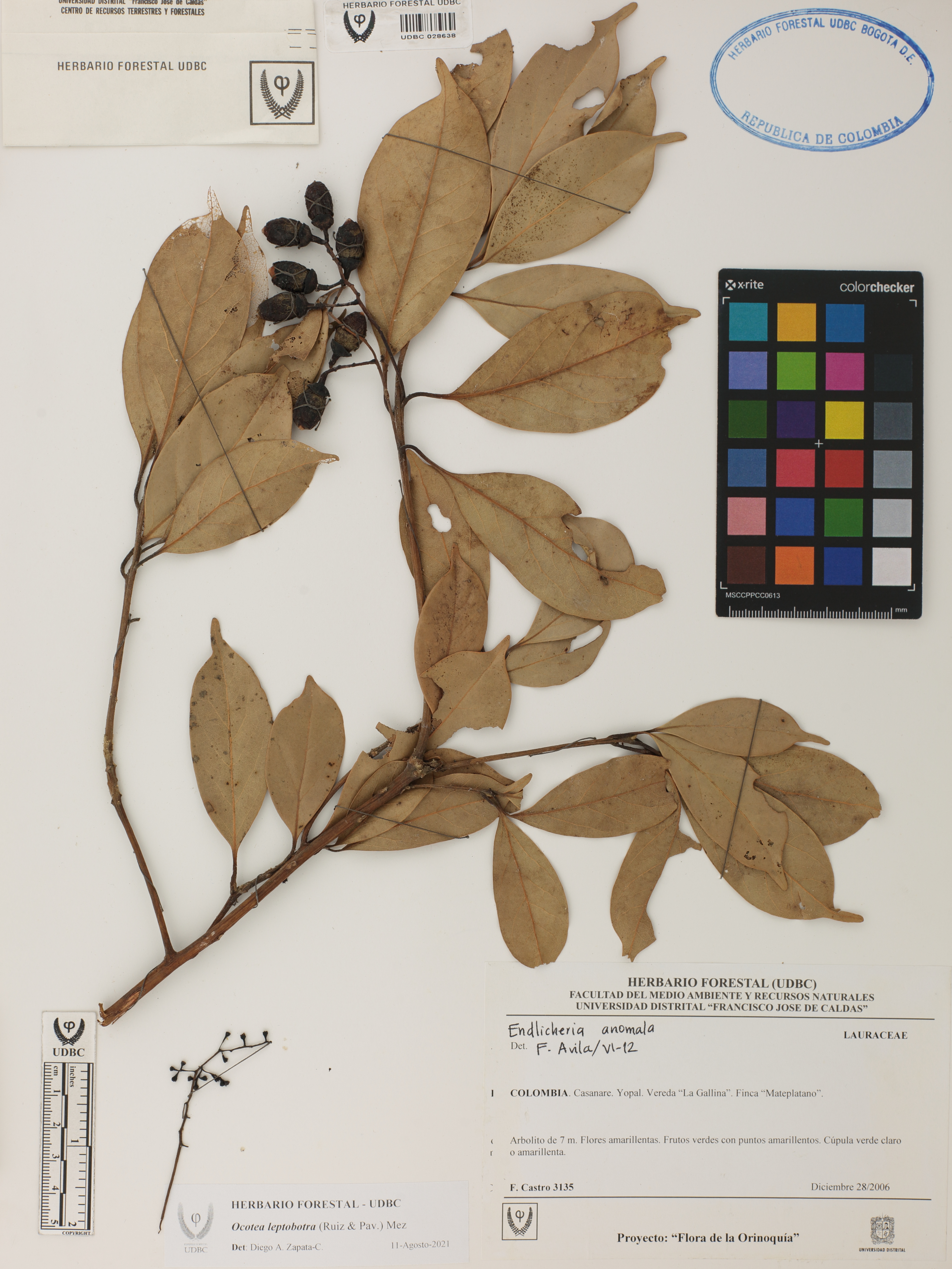 Fotografía del ejemplar Castro, F. 3135, determinado como Ocotea leptobotra en el año 2021