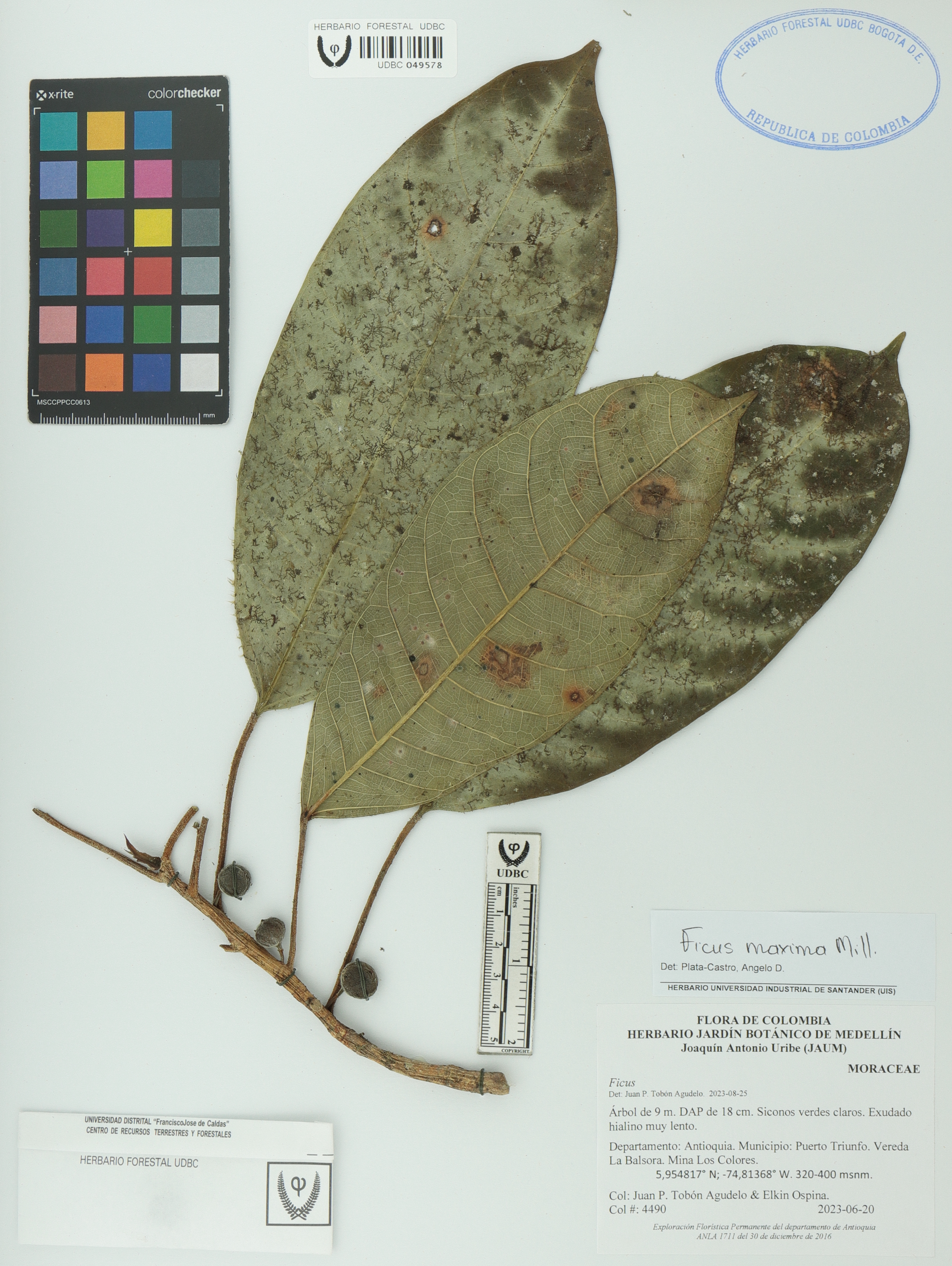 Fotografía del ejemplar Tobón-A., J. 4490, determinado como Ficus maxima en el año 2023