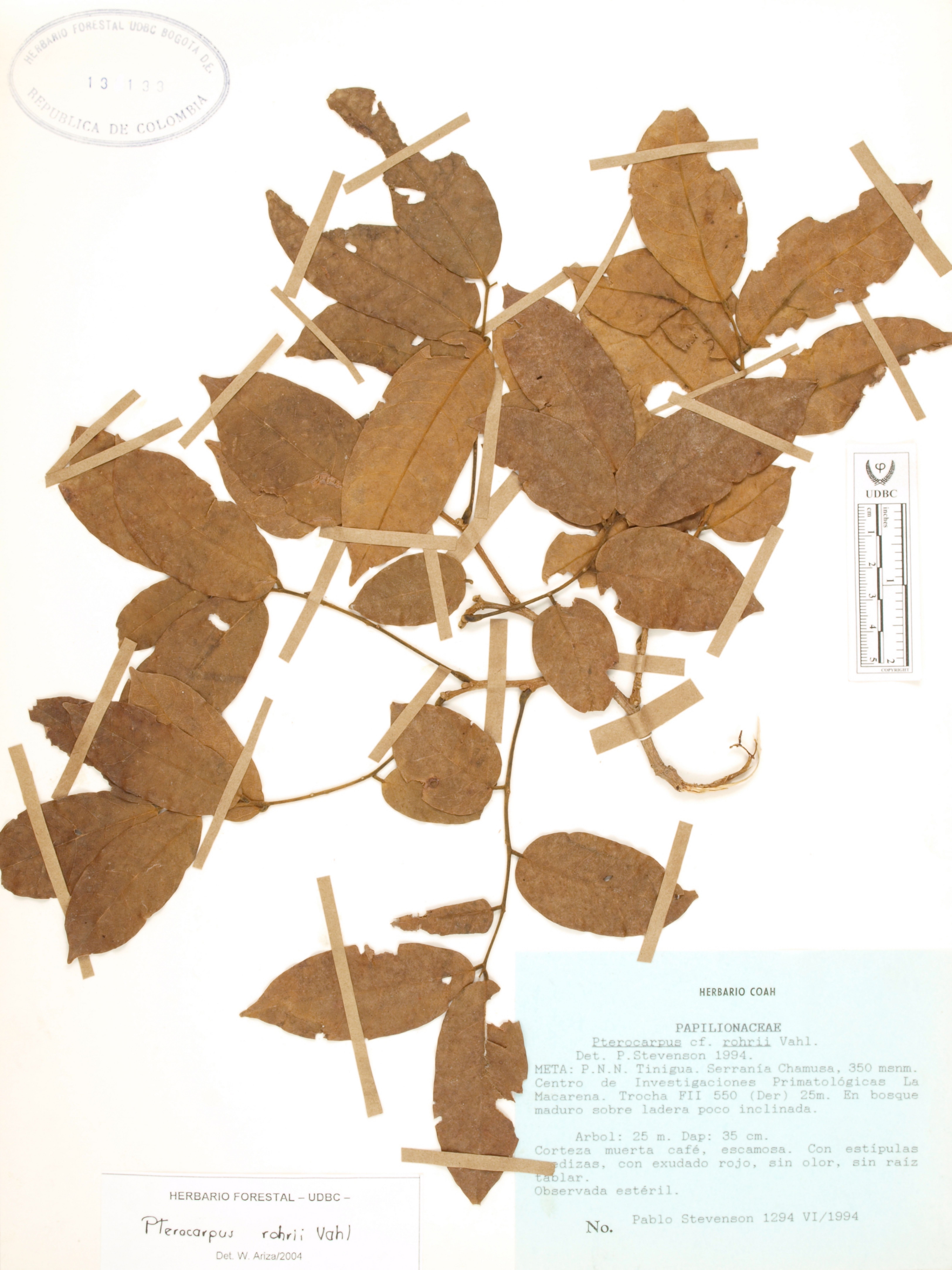 Fotografía del ejemplar Stevenson, P. 1294, determinado como Pterocarpus rohrii en el año 1994