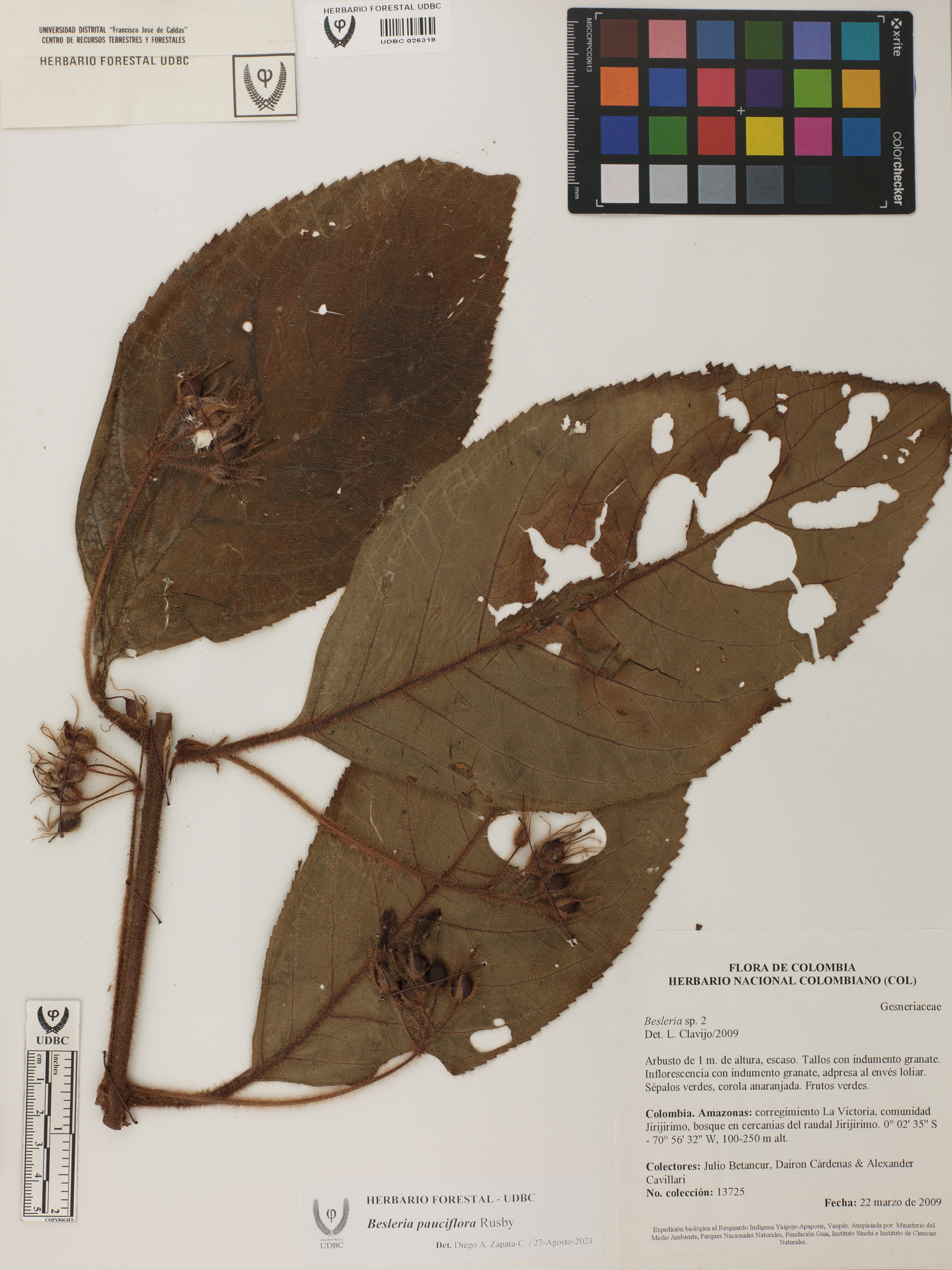 Fotografía del ejemplar Betancur, J. 13725, determinado como Besleria pauciflora en el año 2021